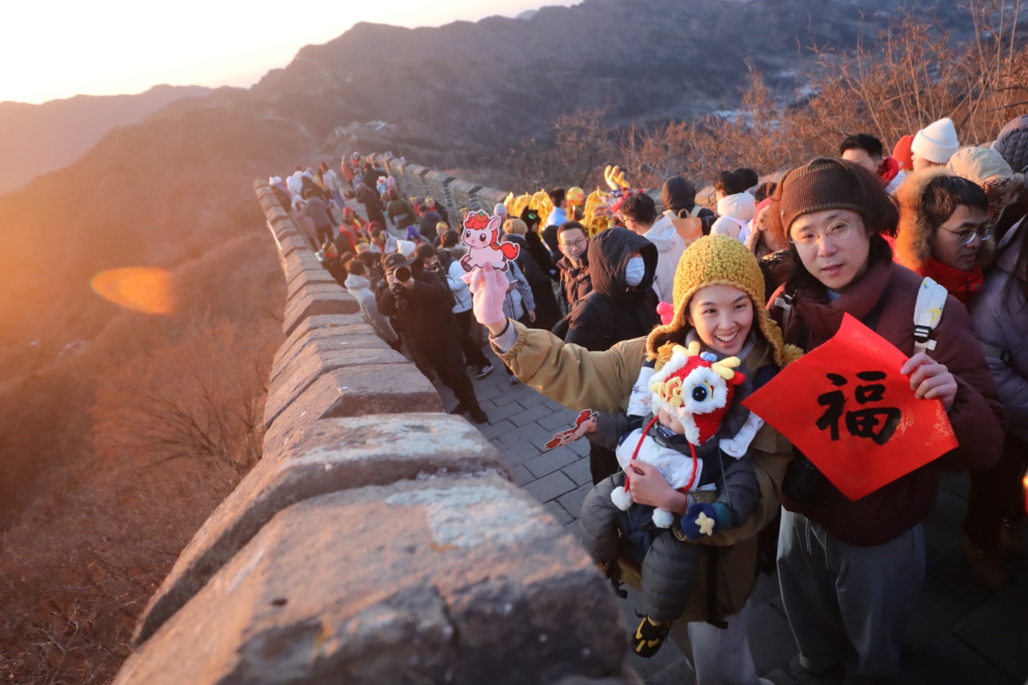 “我们特地从杭州过来,想让孩子在长城上感受一次‘新年伊始,万象更新’的意义。”在洒满晨光的垛口旁,带着9岁儿子的陈先生告诉记者,孩子则骑在他的肩头静静欣赏。