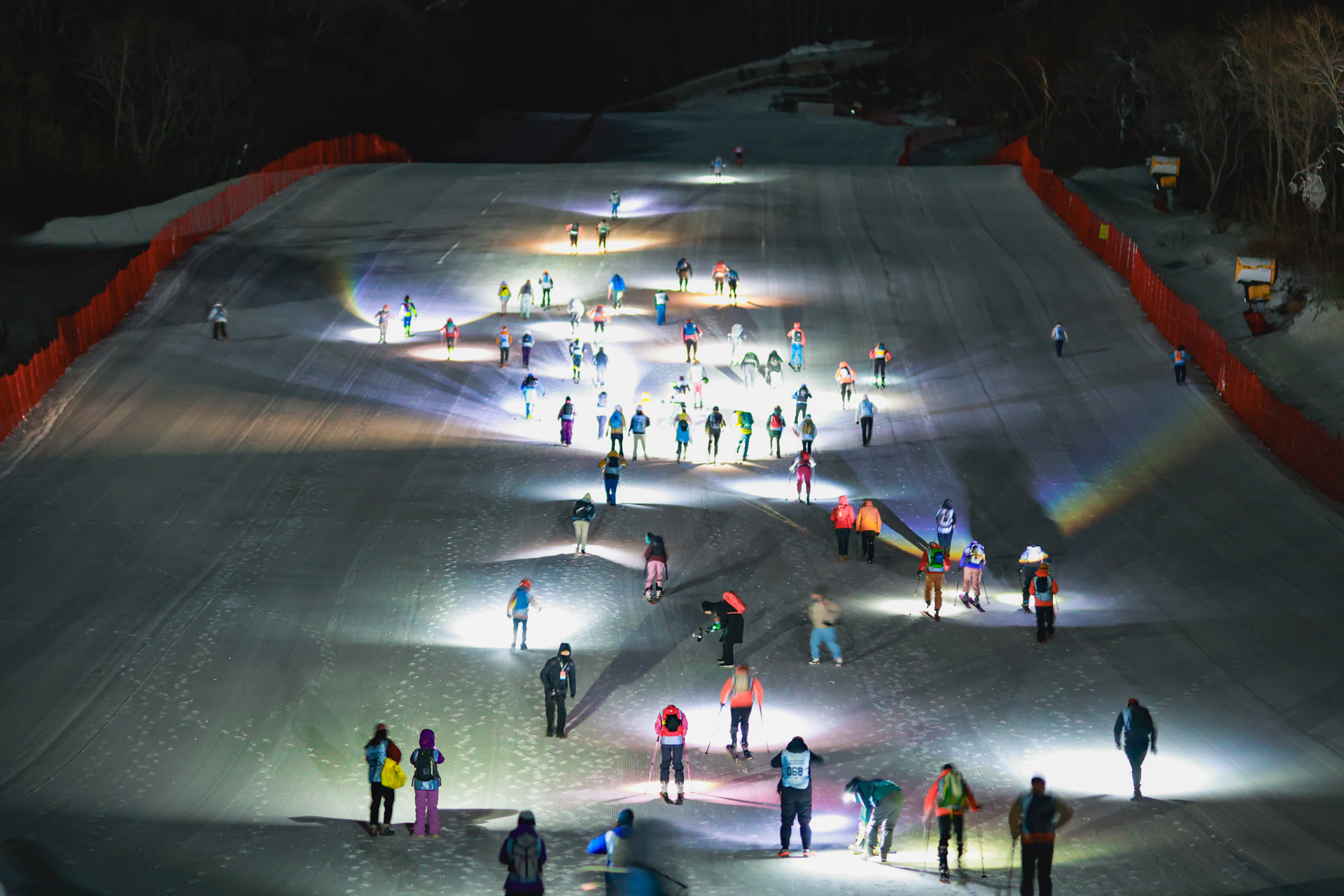 清晨6时,比赛正式开始。选手们有序出发,延雪道“逆向”攀登而上,头灯发出的光亮散布在尚未破晓的夜色中,宛如点点星光。本次比赛竞赛项目为滑雪登山中的“垂直竞速赛”,但海拔上升比竞技赛事的垂直竞速赛更大。选手们踩着带有专用固定器、贴有止滑带的雪板奋力前行,挑战极限。