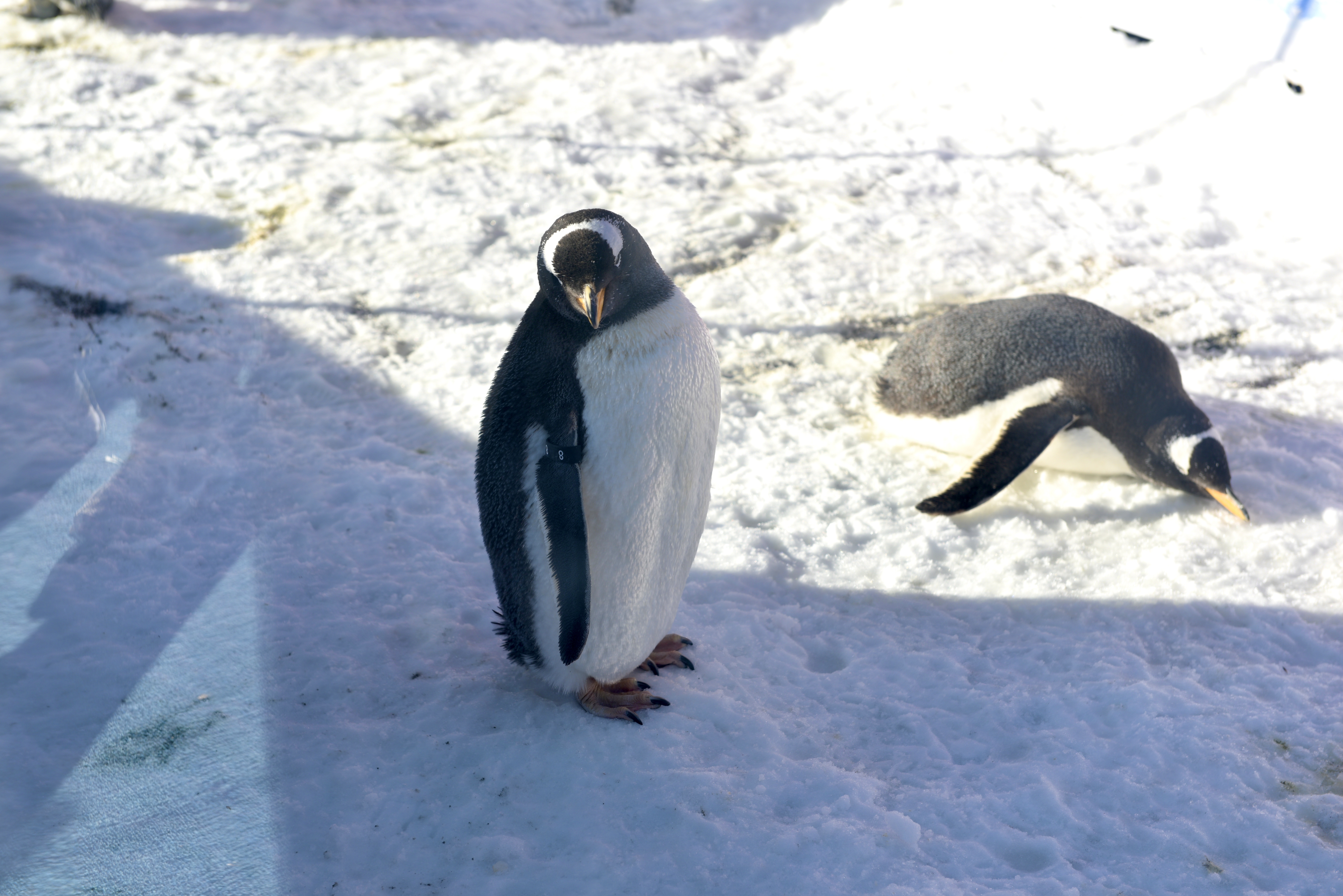 上午10点,备受期待的企鹅巡游如约开启,几只憨态可掬的企鹅,在工作人员的悉心陪同下走出恒温场馆,迈着标志性的摇摆步伐在雪地上缓缓前行,黑白相间的身躯沾着点点雪粒,时而驻足张望、时而轻拍翅膀,偶尔低头啄食积雪,一举一动都尽显灵动可爱,瞬间成为全场焦点。