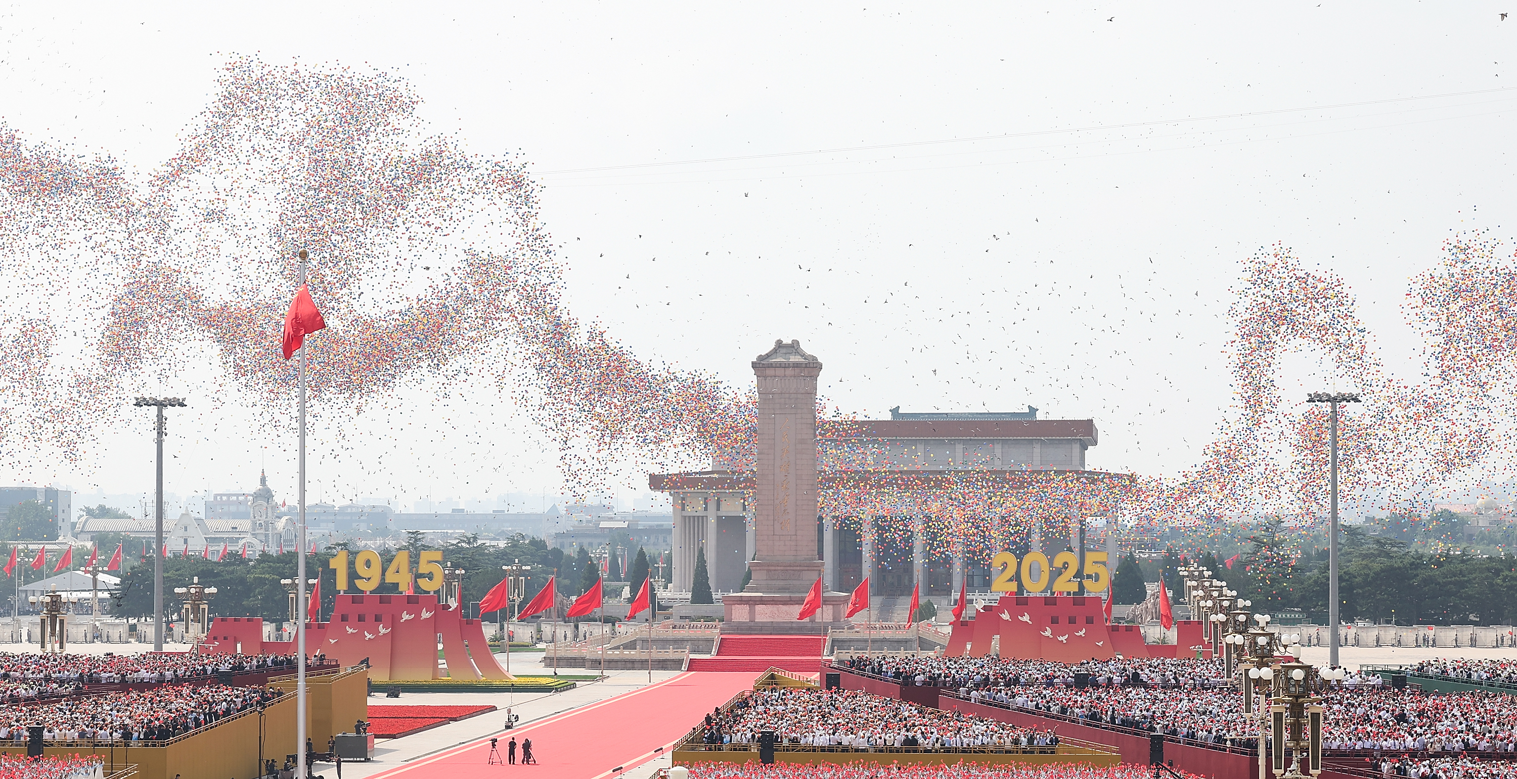 2025年9月3日,纪念中国人民抗日战争暨世界反法西斯战争胜利80周年大会在北京隆重举行。这是纪念大会现场放飞和平鸽和气球。新华社记者 姚大伟 摄