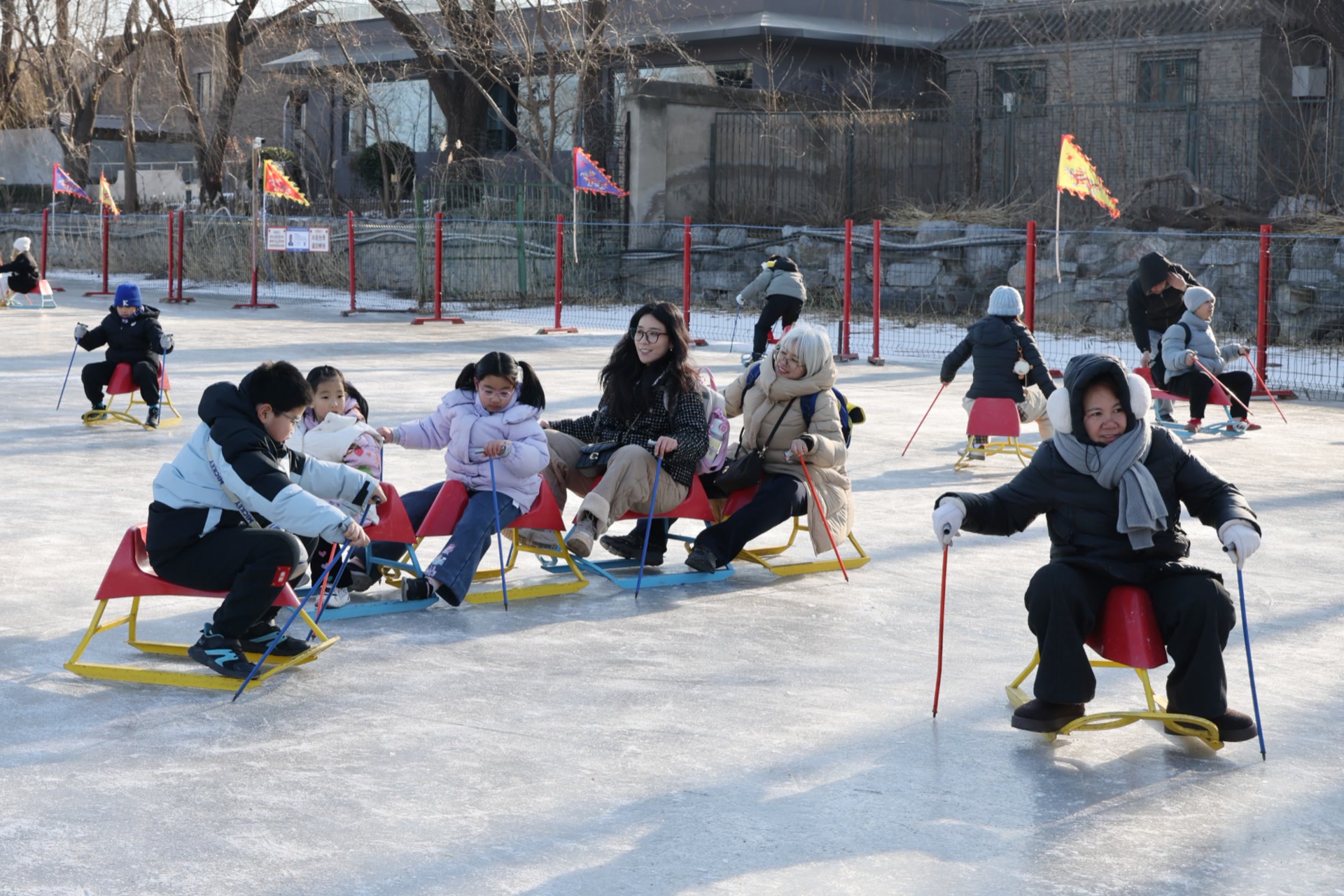 冰场依旧是本届冰雪季的核心亮点区域,选址于圆明园福海、凤麟洲两大标志性水域。其中,福海作为园区最大的户外冰场,5万平方米的开阔冰面如镜面铺展,为游客提供了广阔的驰骋空间。冰面上,身着各色冬装的游客往来穿梭:年轻情侣并肩乘坐双人冰车,手牵手笑意盈盈;小朋友们踩着“小海豚”滑冰助手,在家长的搀扶下慢慢试探,偶尔的小趔趄也化作清脆的笑声;资深冰友则脚踩冰鞋,时而匀速滑行,时而灵活转身,冰刀划过冰面留下清晰的轨迹。