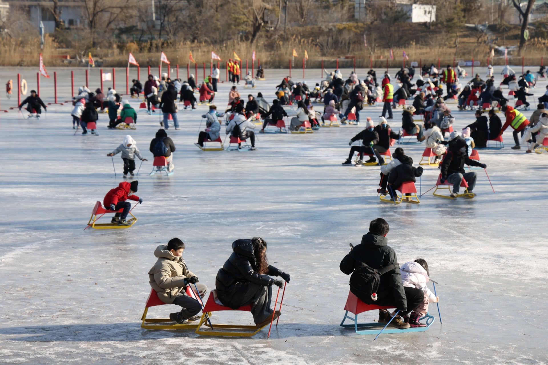 而凤麟洲冰场则聚焦亲子互动,经典的冰车、冰上自行车项目之余,人气爆棚的电动狗拉雪橇依旧温情上线,家长与孩子携手驰骋冰面,欢呼声、笑声交织在一起,定格温馨的亲子时光。