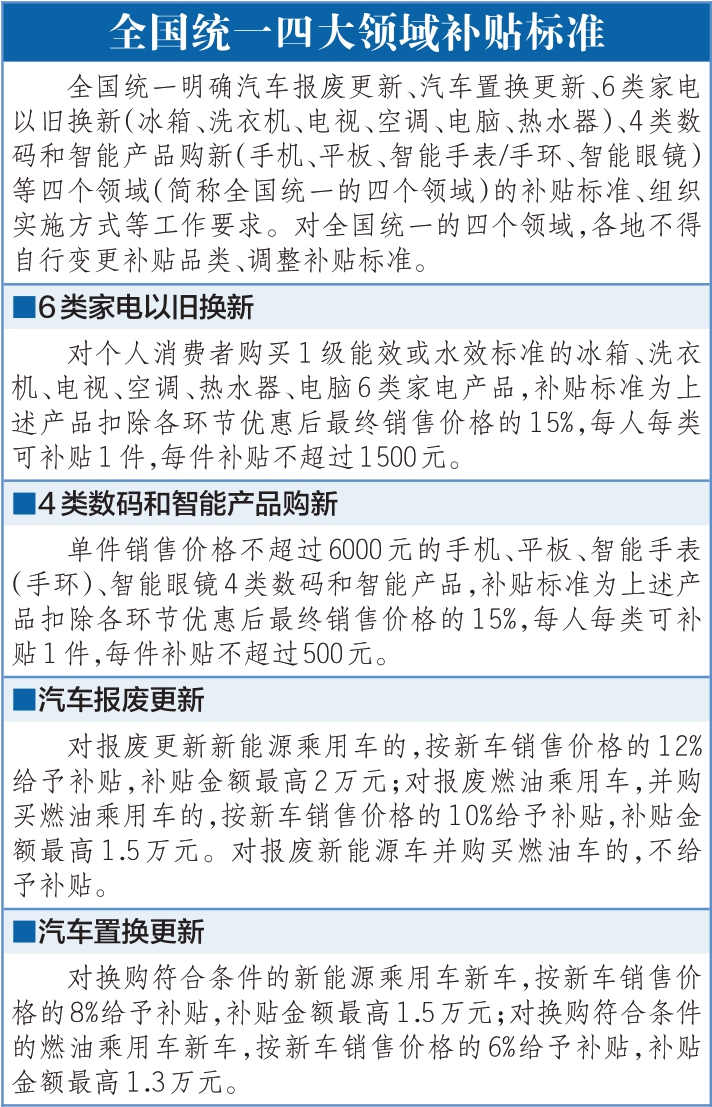 2026年“国补”细则公布。昨天,商务部等5部门发布《关于做好2026年家电以旧换新、数码和智能产品购新补贴工作的通知》,对纳入补贴的6类家电产品每件补贴不超过1500元,4类数码和智能产品每件补贴不超过500元。