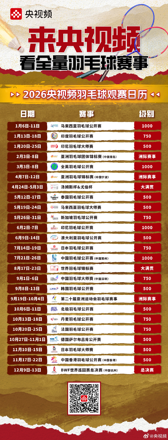 2026年央视频羽毛球观赛日历来袭!全英公开赛、亚锦赛、汤尤杯、中国公开赛、世锦赛、中国大师赛、亚运会羽毛球项目、总决赛等赛事全年精彩不停!