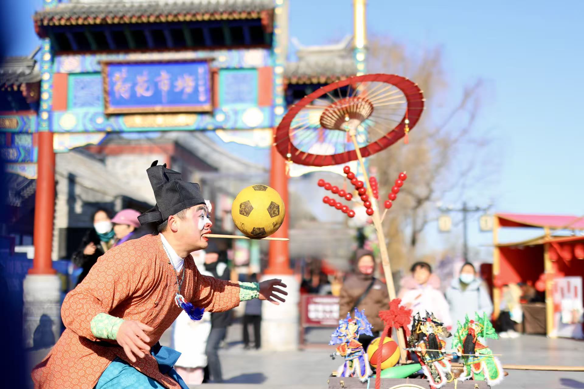糖葫芦、龙须酥、吹糖人等传统美食一应俱全,六必居、庆云楼、内同兴等京城老字号摊位前更是排起长龙,刚买到糖葫芦的小朋友开心地说:“这个冰糖葫芦又酸又甜,太好吃了!”