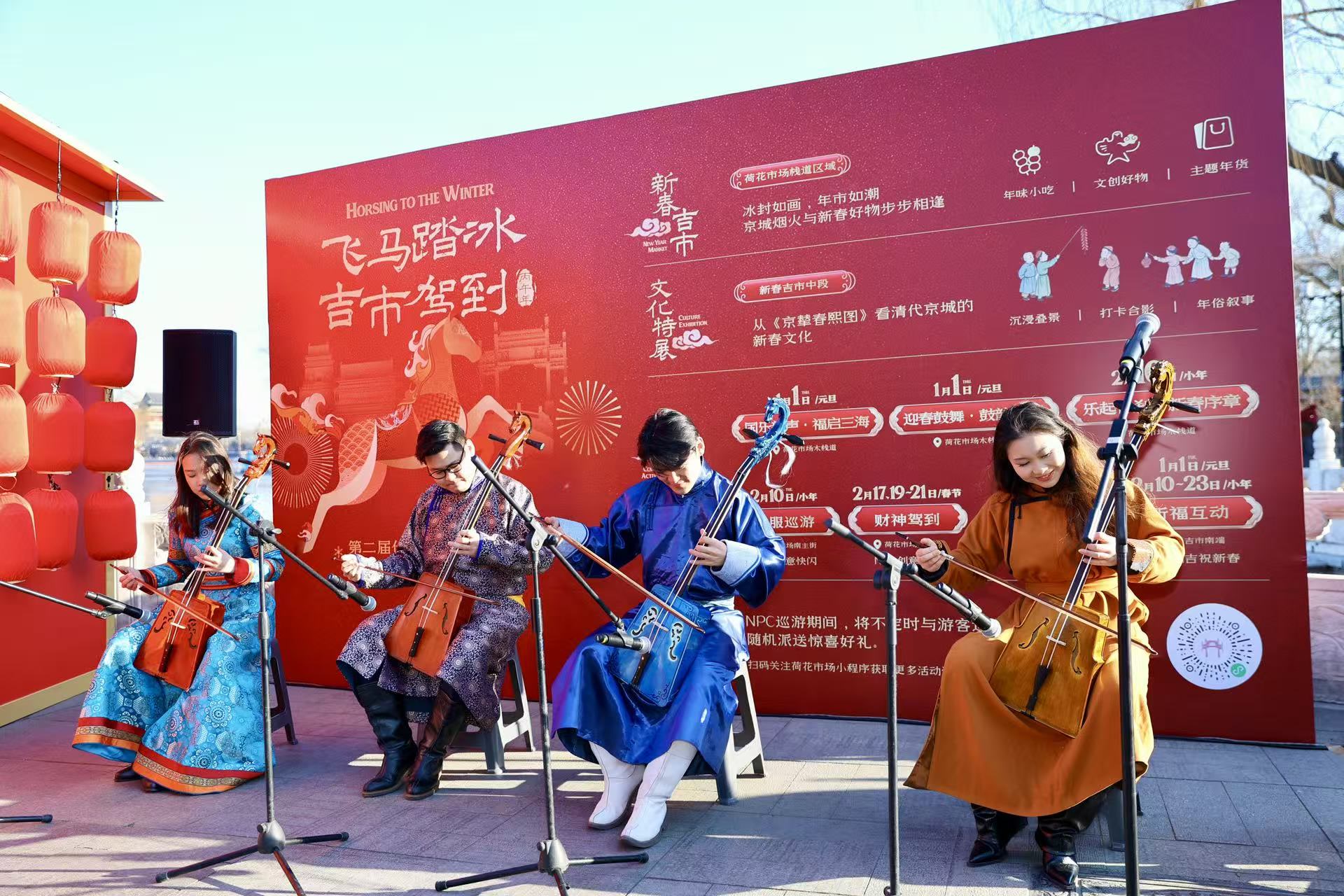 白塔寺药店、中轴线文创、故宫角楼文创、南锣礼物等特色商品摊位前,本地市民和游客一起挑选伴手礼。一位外地游客兴致勃勃地分享:“这里的北京文创又新又漂亮,我买了一大堆,把新年的祝福带给家人朋友。”