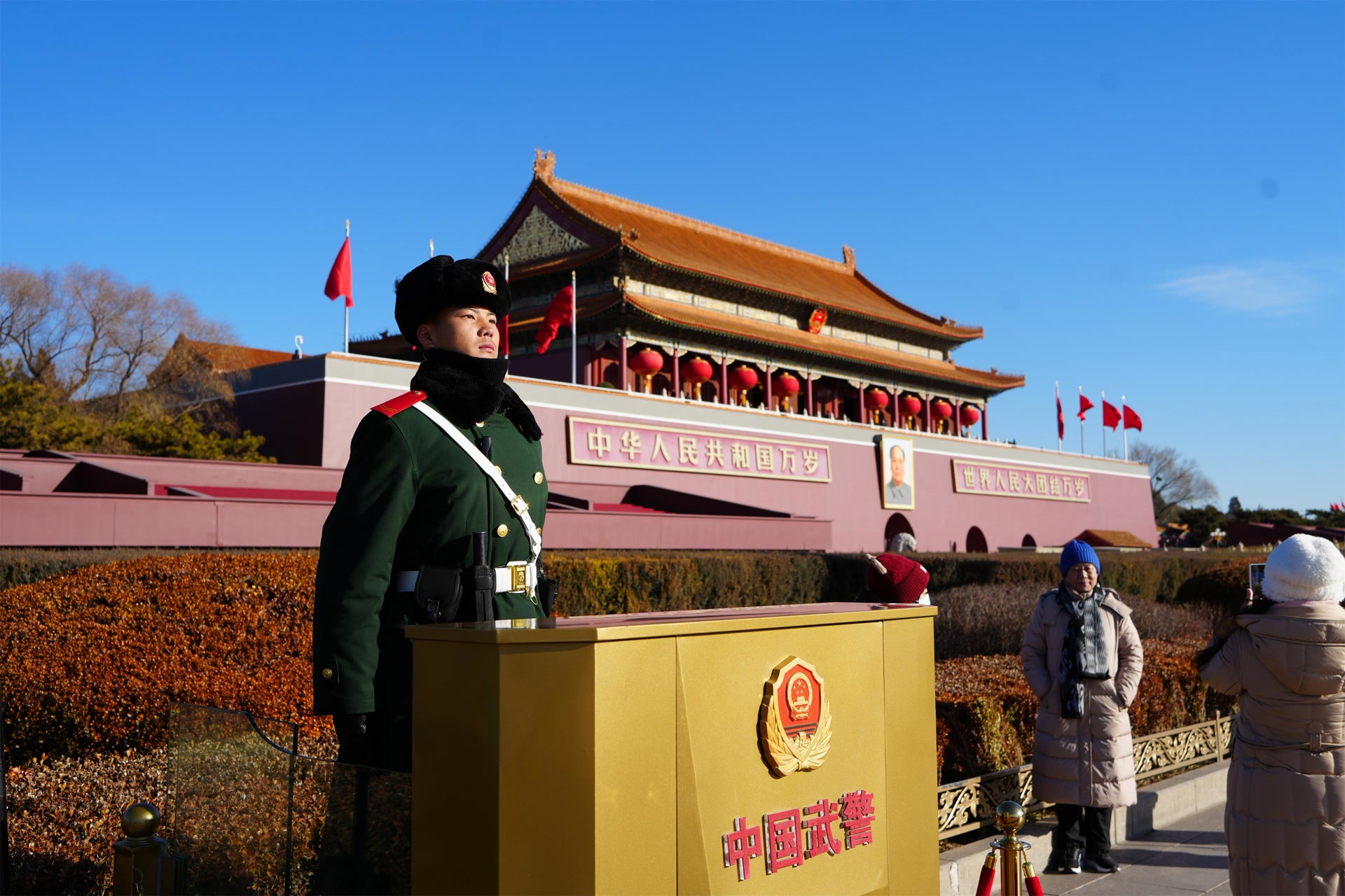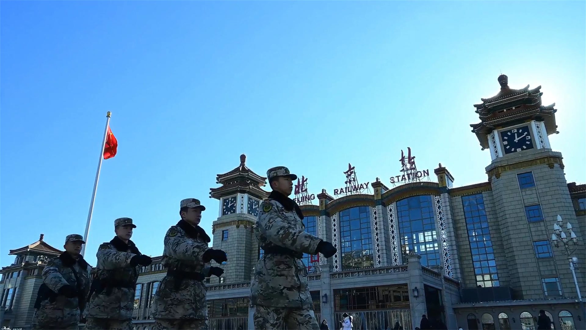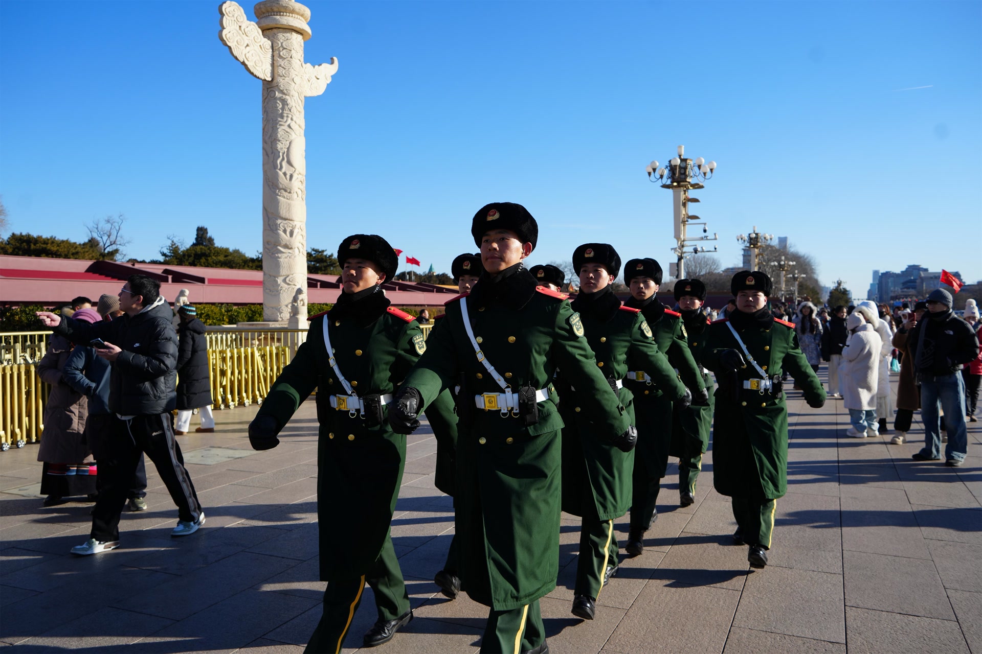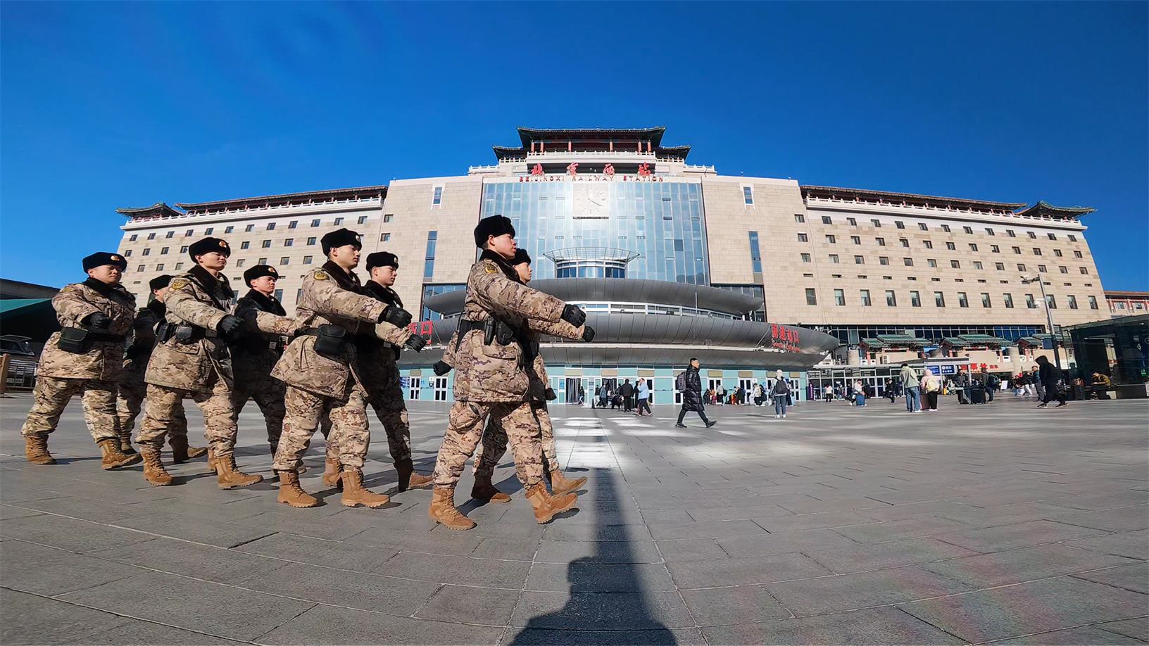 2026年元旦假期,北京各大景点迎来了客流高峰,担负景点、火车站、机场等人流密集商业区巡逻警戒的武警北京总队官兵全时坚守战位,保障群众和旅客平安出行。