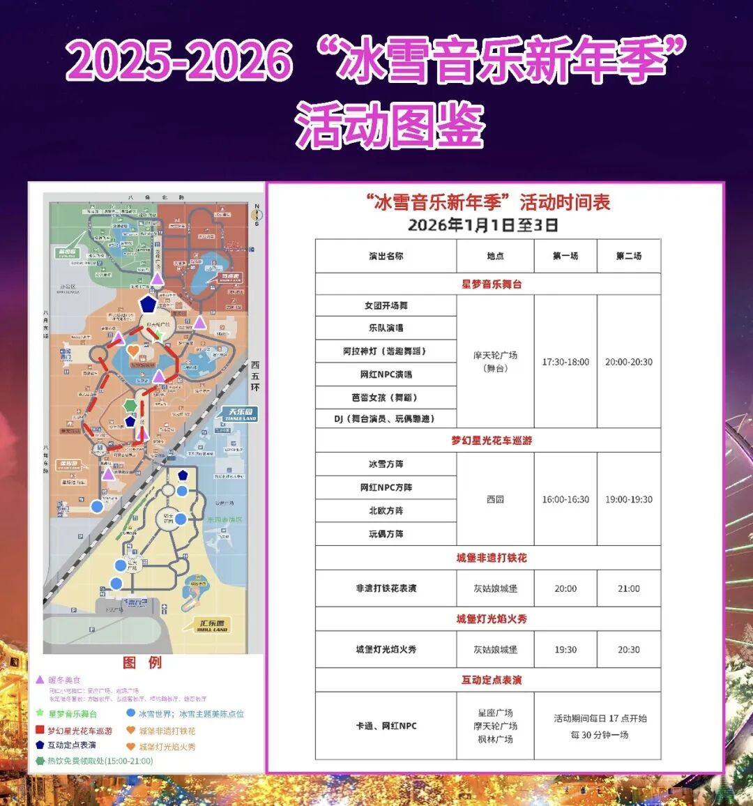 这份快乐!不打烊!2026年1日-3日,非遗打铁花、冰雪花车巡游、NPC 互动、人工降雪、免费暖冬梨汤(15:00-21:00 星座大道热饮站)、超多游乐项目以上全部统统安排!