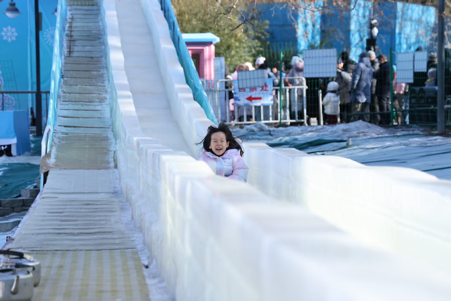 在紫竹院公园冰雪活动区域,首先迎接大家的就是公园IP形象竹笋宝宝。游客们纷纷上前拍照合影,脸上洋溢着新年的幸福感。不远处,80米长的网红大型冰滑梯,大人和孩子们尽情享受速度与激情带来的快乐,欢笑声不断。