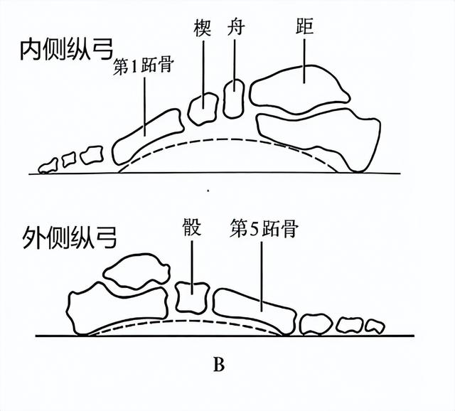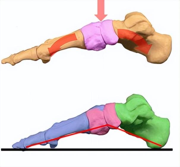 上图左侧两图为纵弓,右图展示足弓如何通过舟骨、楔骨分散人体载荷