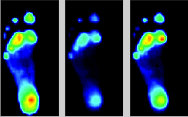 我们的脚与地面接触时,通常有三种模式:左图可见外侧用力偏多,这就是我们常说的“足内翻”,中间图压力比较均衡,右图内侧受力偏多,即“足外翻”。左图与右图中,在前足中部都有一片红色区域,就可能是“横弓塌陷”的信号。而平足(左图:足中部压力分布过广)、高弓足(中图:足中部压力过少),也都会打破这种平衡。健康足的核心优势,就是让压力分布更均匀,让耐压部位多承重、娇嫩部位少受力,实现“足底受力平衡”。
