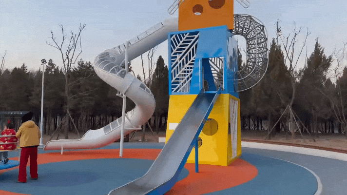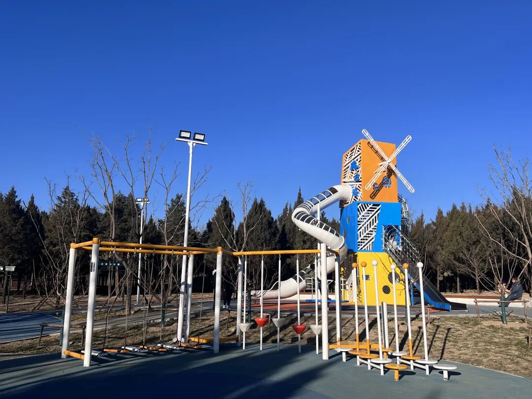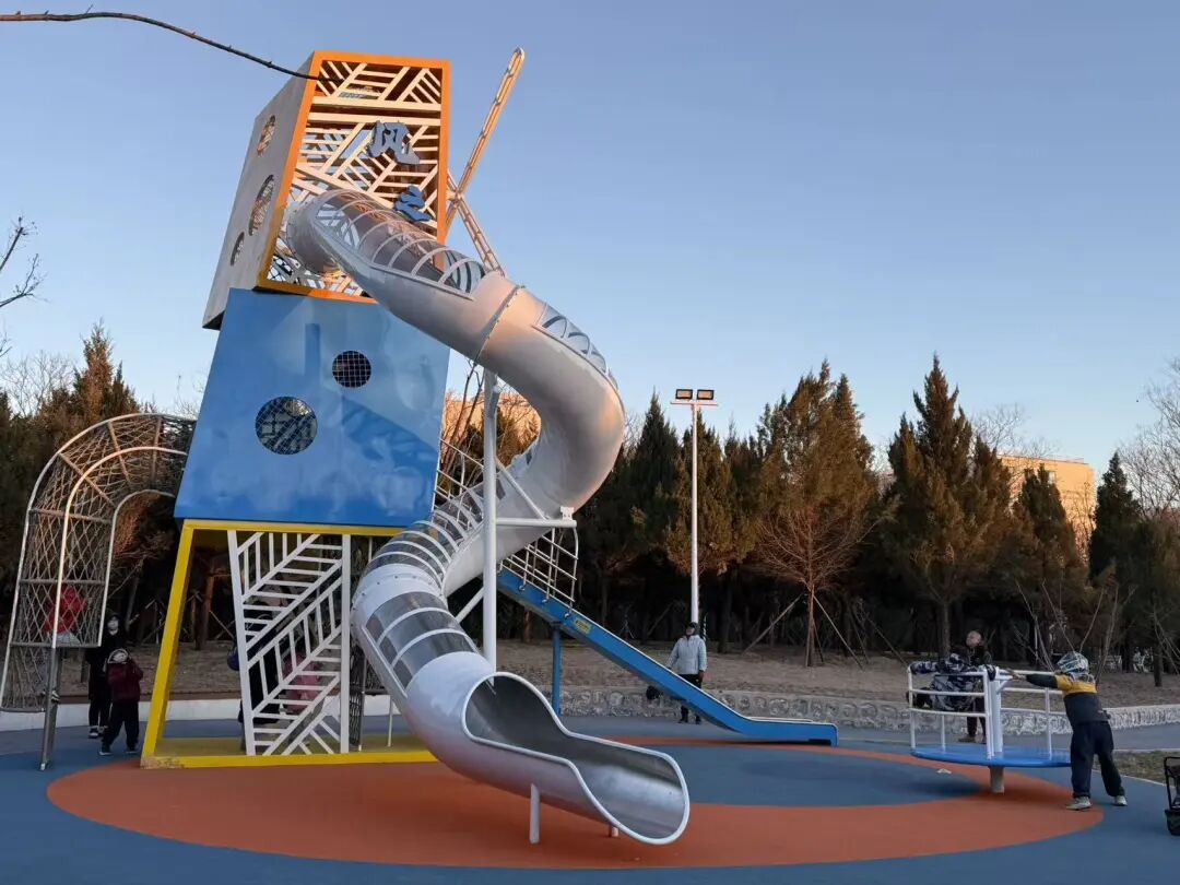 在一旁的两个半场篮球场上,橙红色的围栏格外醒目,运球声、叫好声,让公园多了几分青春活力。位于公园中心点位的儿童游乐区也俨然是一片欢乐的海洋。绳网攀爬架、摇摇乐等设施色彩明快,安全环保。最夺人眼球的“风之塔”游乐设施,则是将风车造型和旋转滑梯融为一体,成为了不少小朋友的“心头好”。“这些儿童游乐设施设计得非常用心,孩子玩得安全,我们也更放心。”家长们或在一旁守护,或举起手机记录下孩子的欢乐瞬间。