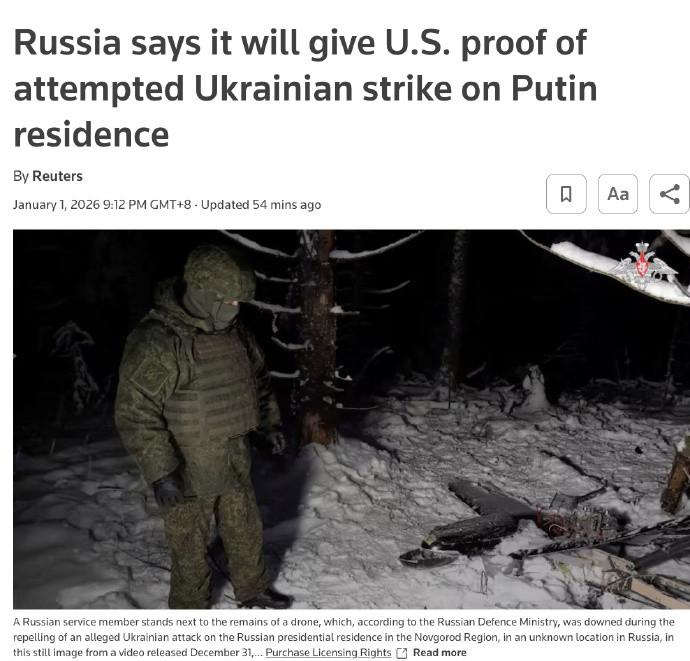 据路透社消息,俄罗斯当地时间1月1日表示,已从本周早些时候击落的一架乌克兰无人机中提取并破译文件,称该文件显示无人机曾将俄总统官邸作为打击目标,俄方将把相关信息移交美国。