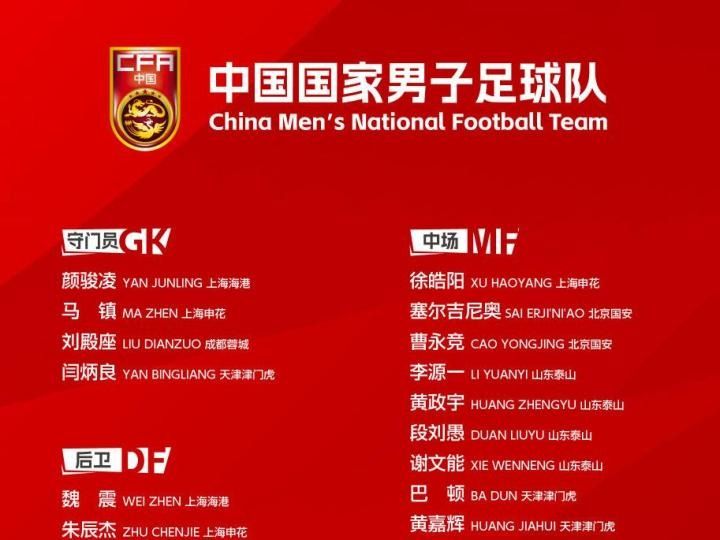 中国足协1日公布了中国男足国家队2026年第一期26人集训名单,李扬、闫炳良、马镇、吕焯毅4名新人入选。这是邵佳一出任中国队主教练后的首期集训,他将带队于1月4日至27日先后在广东和阿联酋迪拜集训。详情>>