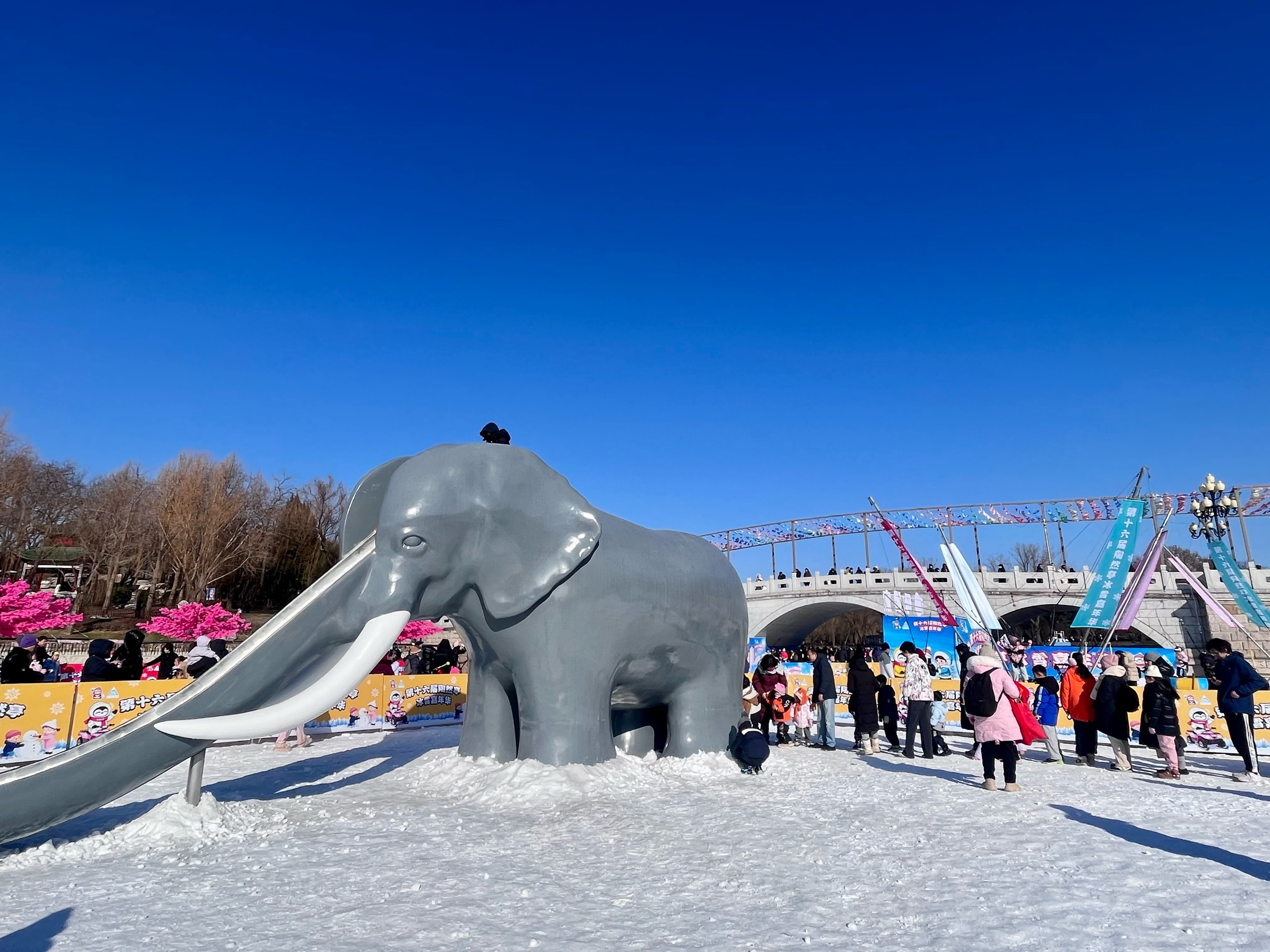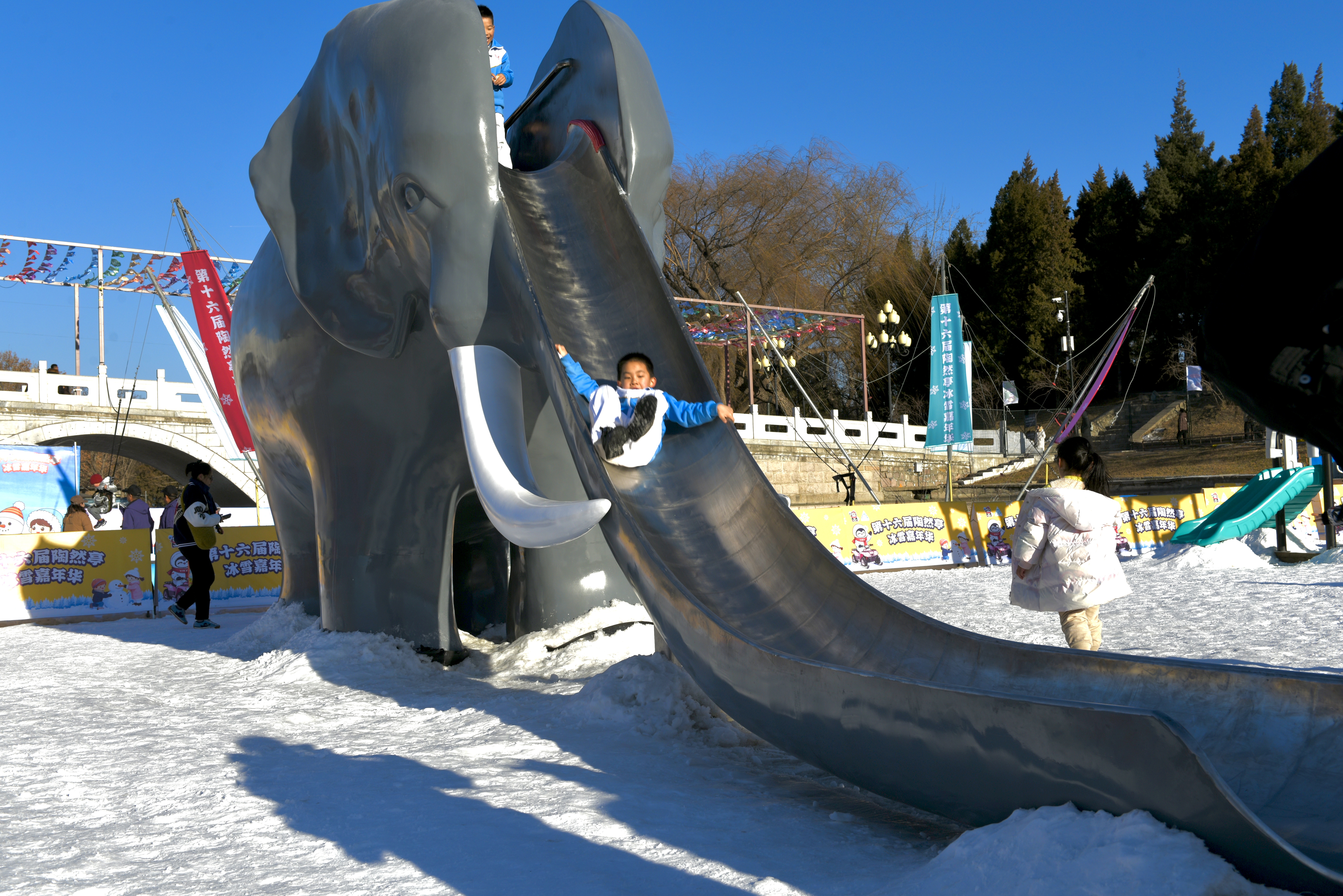 冬日的陶然亭公园南湖中央,一座复刻版的大象滑梯静静矗立在皑皑白雪中,圆润的身形、标志性的长鼻子滑道,一亮相便成为第十六届陶然亭冰雪嘉年华的关注焦点。这座承载着几代北京南城人童年记忆的“老伙计”,以全新材质焕新归来,不仅让游客们驻足体验、重拾儿时欢乐,更带火了公园同款文创冰箱贴,让冬日情怀得以长久留存。
