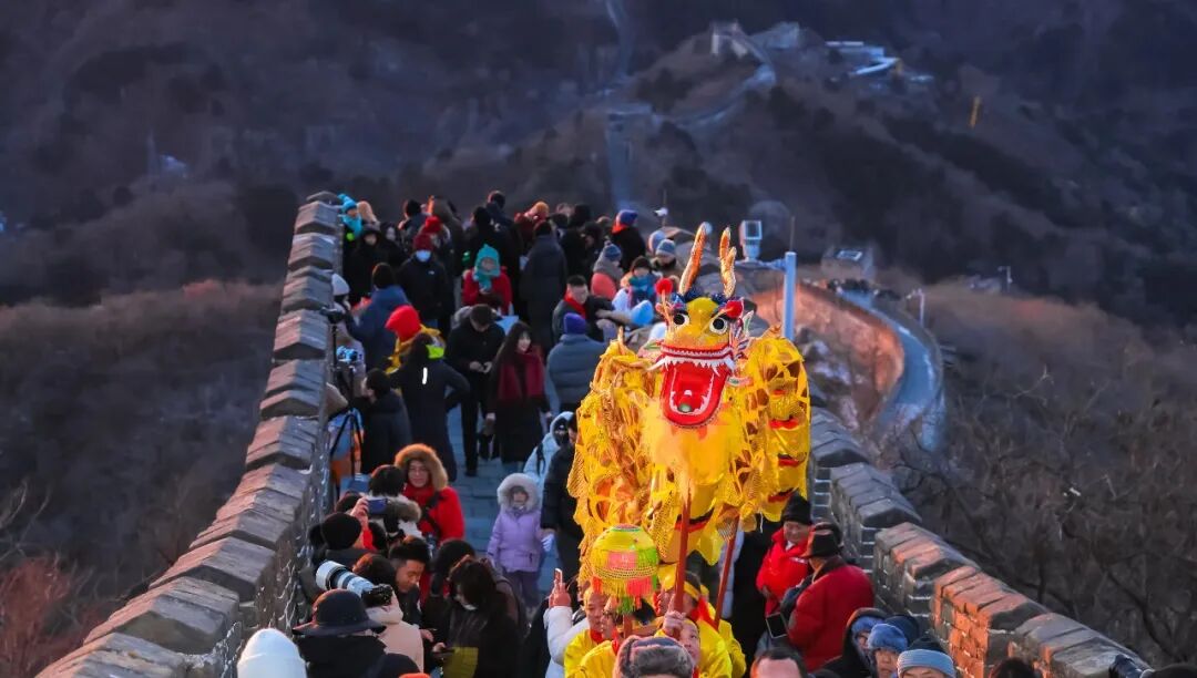 以登长城的方式开启新年,是不少市民游客的选择。慕田峪长城元旦当天举办了系列特色文化活动,游客们不仅欣赏到非遗舞龙舞狮、黄梅戏等传统表演,还观看了富有新意的机器人舞蹈。“活动真丰富!没想到在长城上还能看到各种表演,感觉很惊喜!”一位正在认真听黄梅戏的市民说。
