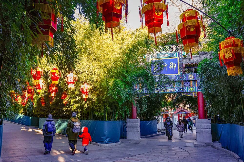红螺寺景区内,红色“福”字灯笼缀满枝头,处处洋溢着喜庆气氛。前来大雄宝殿祈福的游客络绎不绝,不少游客写下新年愿望,仔细地将许愿带系在树下。“希望爸爸妈妈身体健康!”“新的一年,我要生意兴隆!”众多朴实真挚的新年愿望,在古树下轻轻摇曳,寄托着人们对美好生活的期待。