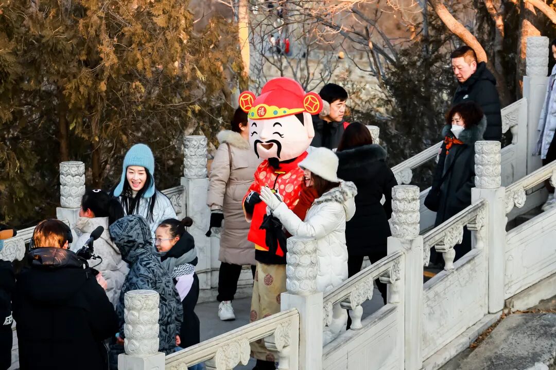 殿外的双喜大钟前热闹有序,等待撞钟的游客依次排队。与朋友一同前来的张女士,在好友的镜头记录下,双手推动钟杵,浑厚的钟声随即在寺院内悠悠回荡。“新年希望家人和朋友都平平安安!”撞完钟的张女士笑容舒展。