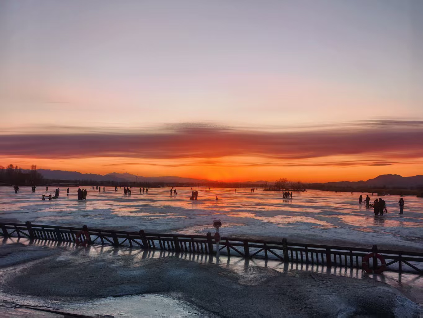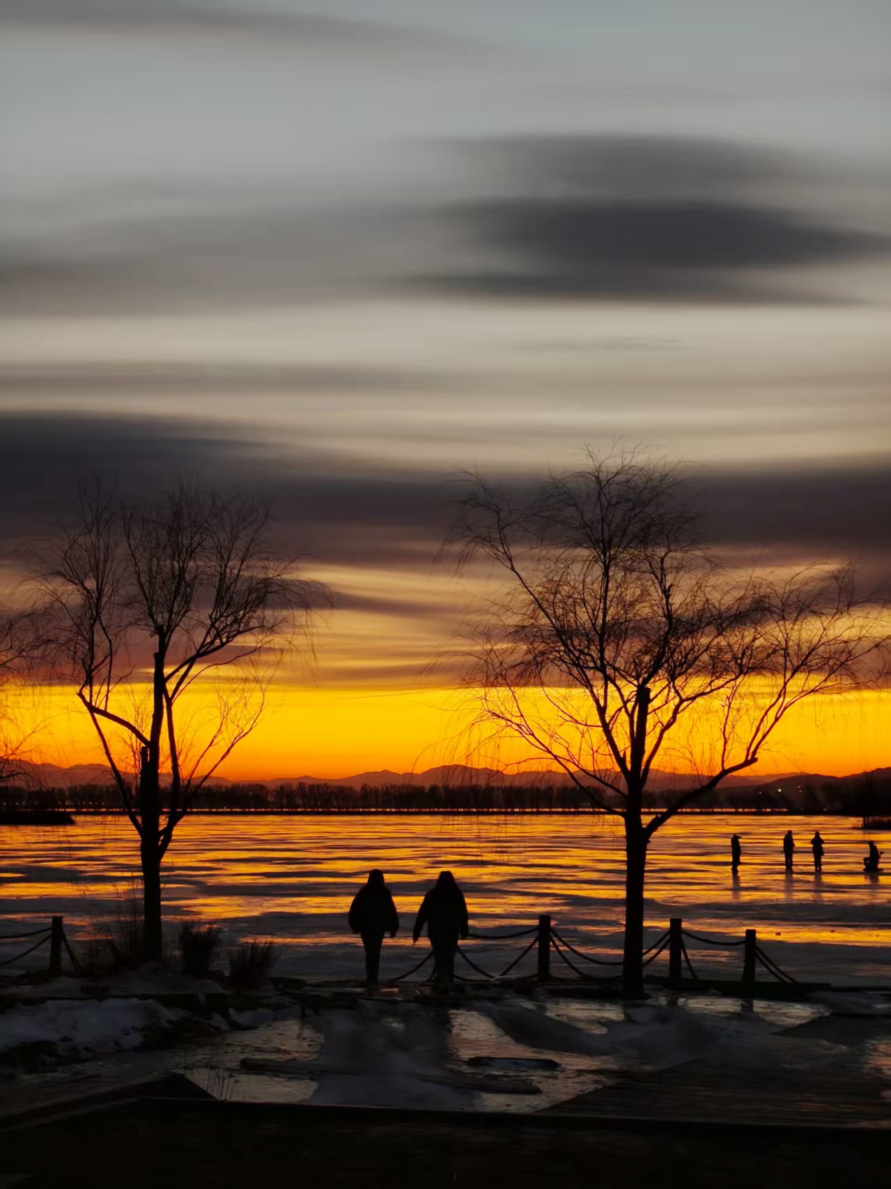 节日期间天气晴好,公园提示最佳拍摄时段为每日16时左右,夕阳西下“黄金光线”最美。核心机位位于园内栈道与芦苇丛交界处、湖西岸碎冰区。