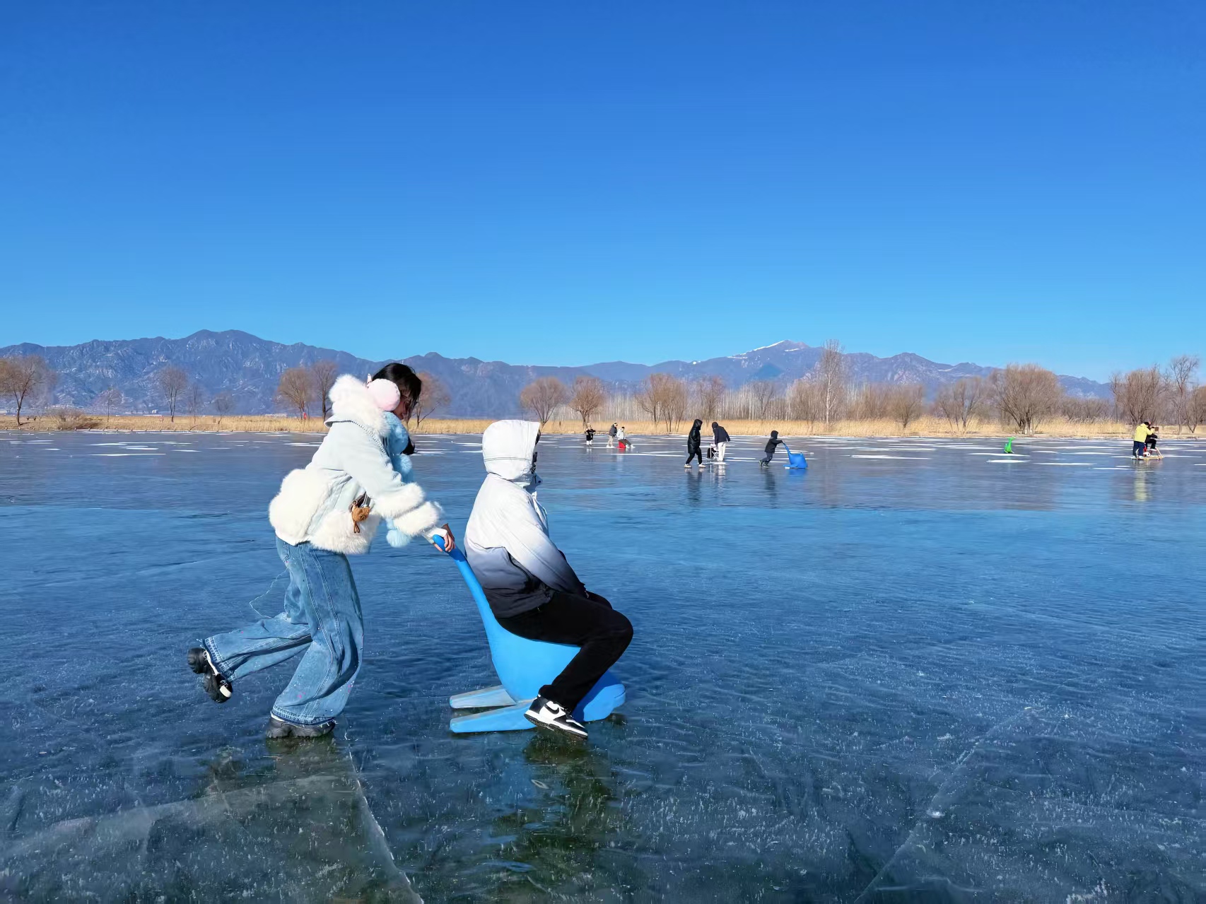元旦假期,野鸭湖国家湿地公园开放天然冰场,游客凭景区门票进入公园,即可免费畅滑,冰车也不收费。