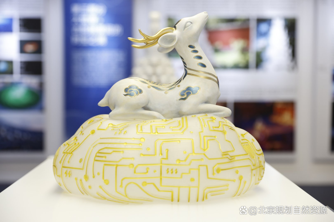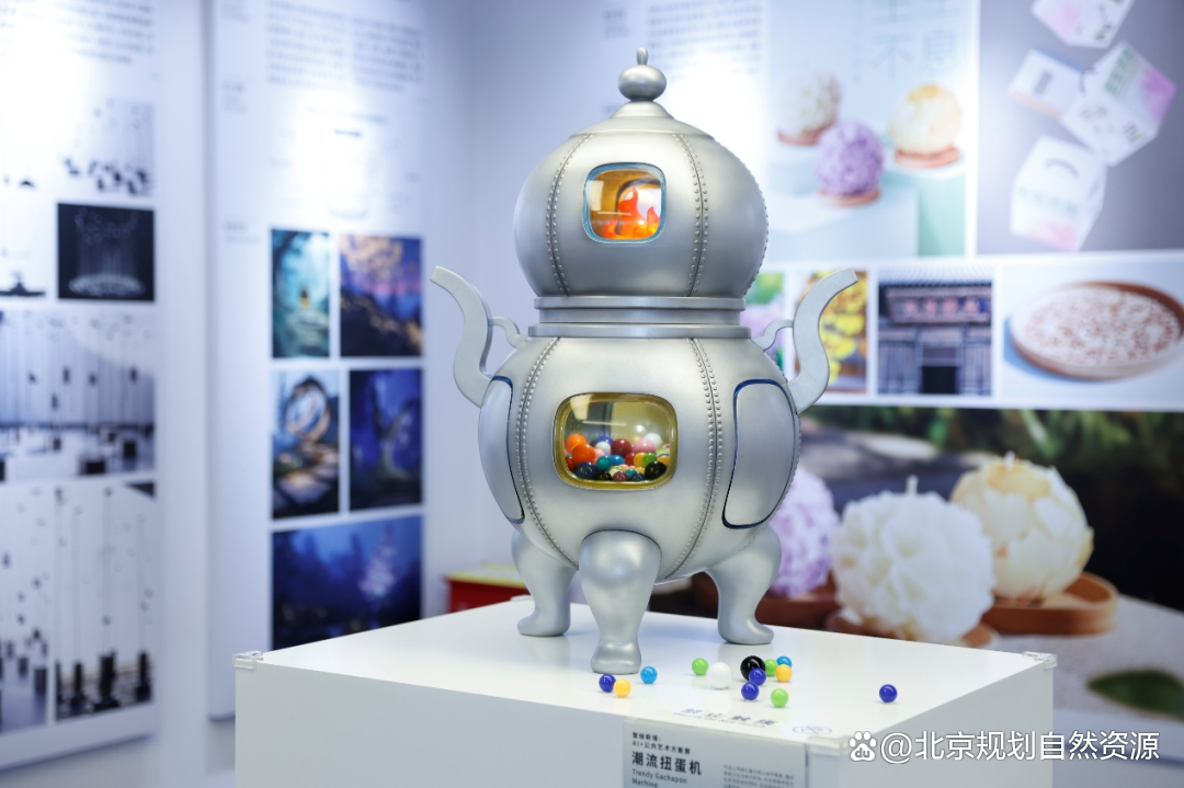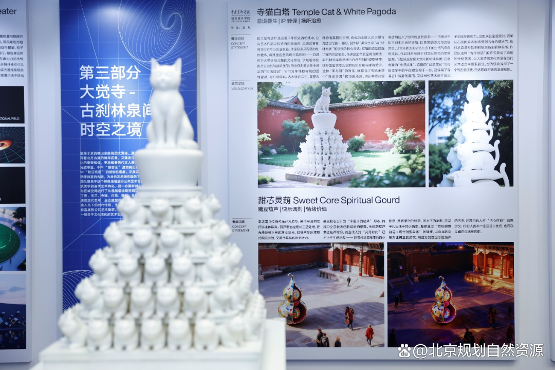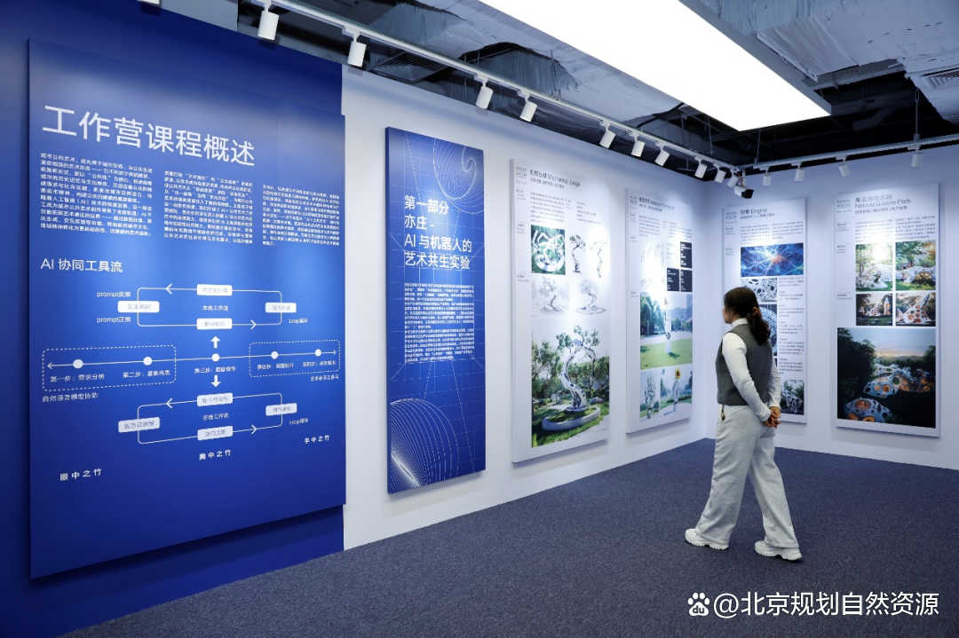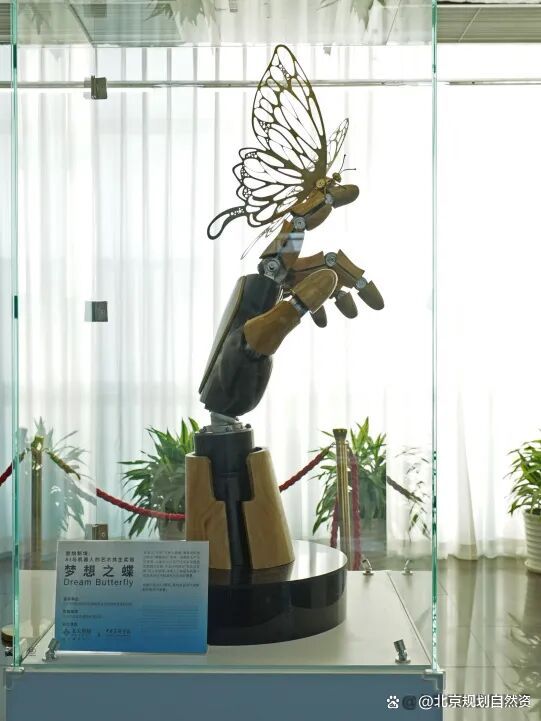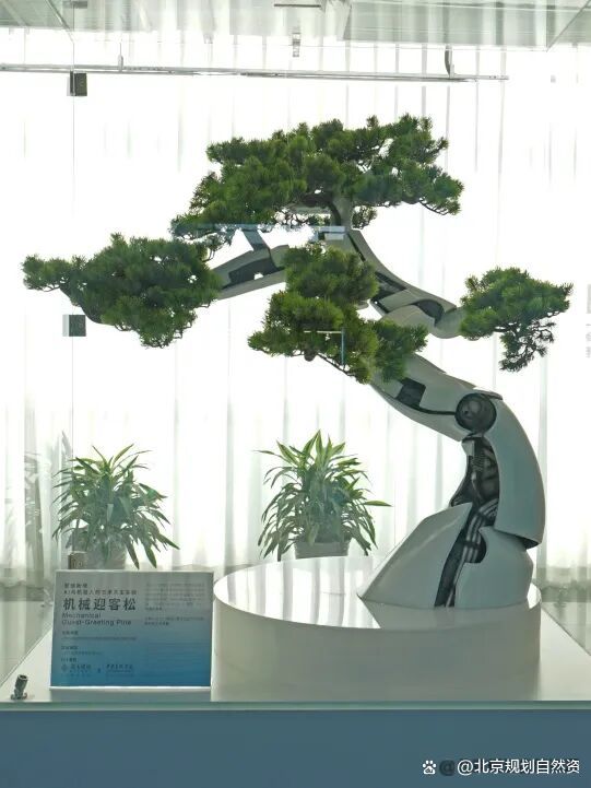 步入展区,三大板块作品各具在地性特色:聚焦北京经开区的方案,将柔性光伏薄膜、机械臂等前沿科技与区域产业跃迁的人文意象结合,为硬核产业空间注入人文温度;围绕北京市规划展览馆的作品,以AI技术重构城市肌理与历史文脉,将宏观规划蓝图转化为可交互的人文符号,打通专业知识与公众认知的壁垒;而针对大觉寺的设计方案,则以AI为纽带活化千年古刹文脉,完成银杏、白塔等传统符号的当代转译,部分文创方案还创新性融入“迷你公共艺术”理念,拓展了公共艺术的传播边界。值得一提的是,课程及工作营的部分实践成果,曾孵化出《梦想之蝶》《机械迎客松》两件作品,于2025年8月亮相世界机器人大会,在国家级科技盛会上完成了科技与艺术跨界赋能的生动表达。