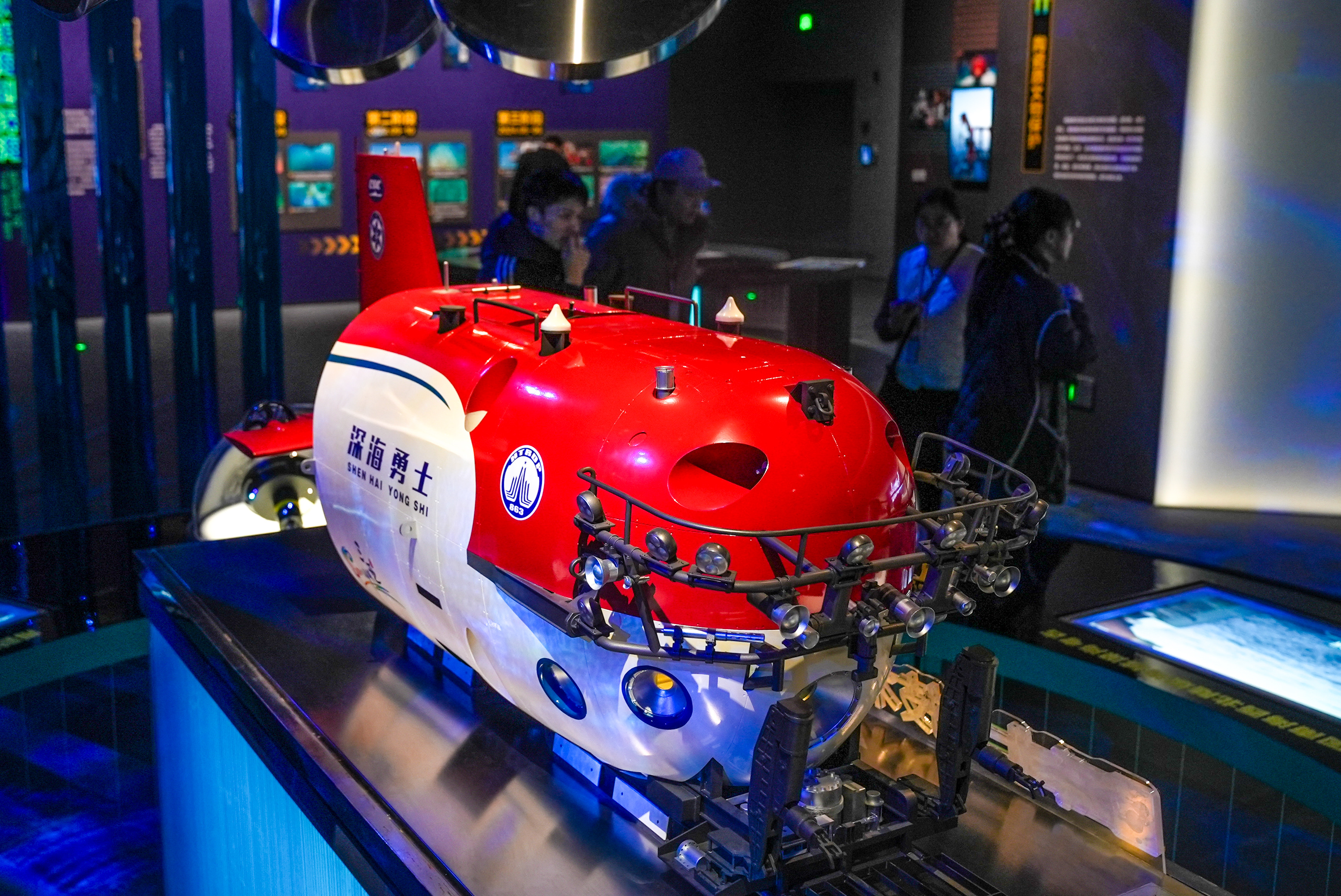 踏着幽蓝的水波纹光影,耳畔传来海浪声与水下探测器的“滴滴”声,观众步入展厅,便“潜”入一片静谧的深海。