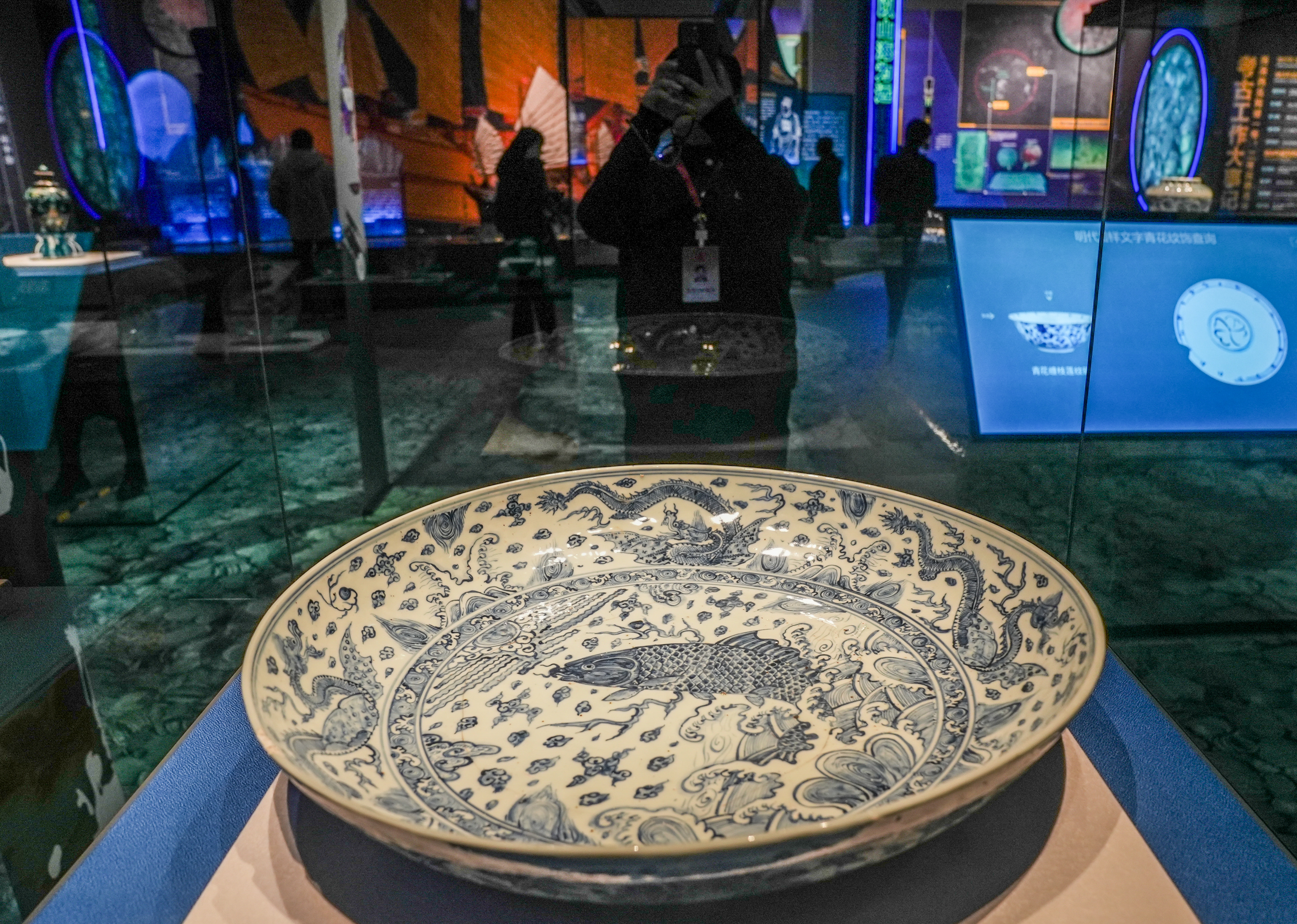 沿着展线前行,“走进沉船”单元中,两艘明代“宝船”依次揭开面纱,377组件出水文物,再现明代中期海上丝绸之路的繁华盛景。一批珐华彩瓷器无疑是展厅里的“明星”,围满了观看、拍照的观众。