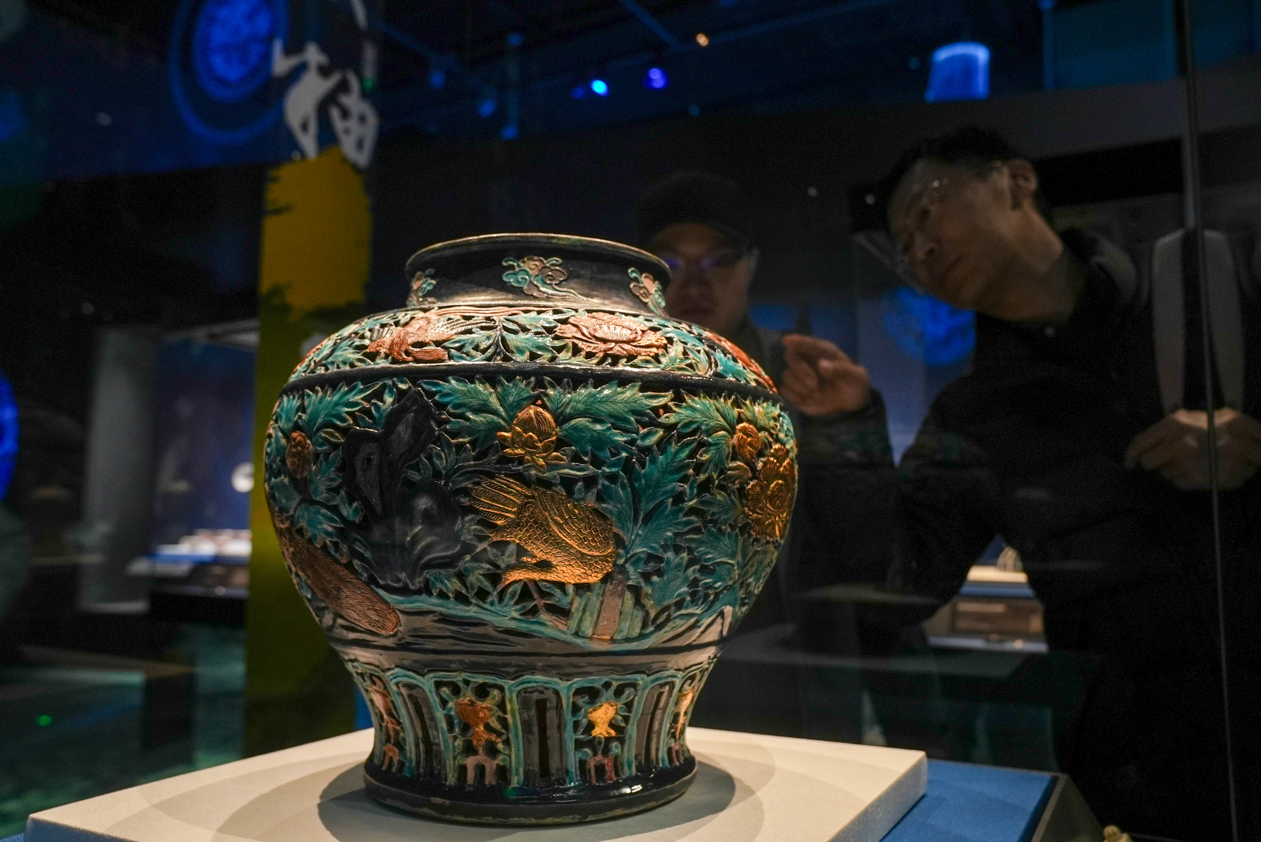 “凤纹、牡丹纹、孔雀纹、仙鹤纹、树石纹、仰莲纹……有的纹样上还有贴金。”站在珐华贴金镂空孔雀牡丹纹大罐前,观众陈女士对照着说明牌 ,为9岁的女儿解读,“这是国内首次发现贴金工艺珐华器,据推测是当时的‘海外高定’。”