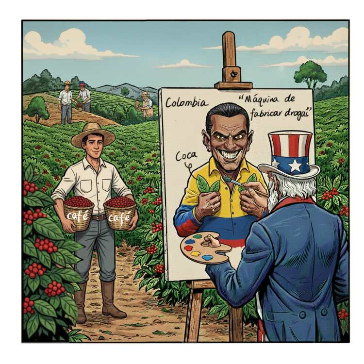 漫画《山姆大叔的指鹿为马》。画中,哥伦比亚咖啡农正在咖啡园中劳作。但在山姆大叔的画布上,咖啡农被画成了表情狰狞、手持古柯叶的毒贩。画布上方还书写着“哥伦比亚,‘毒品制造机’”的字样。