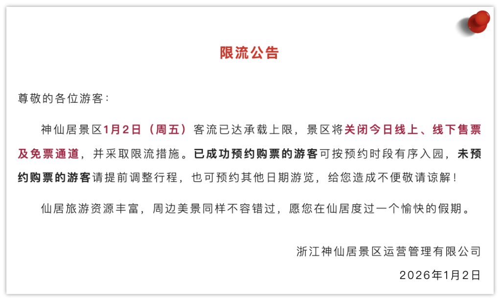 如浙江神仙居景区于1月2日13:08发布的公告显示,神仙居景区1月2日(周五)客流已达承载上限,景区将关闭今日线上、线下售票及免票通道,并采取限流措施。