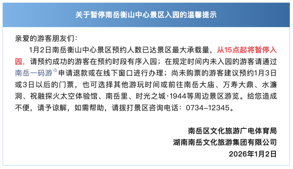 湖南南岳旅游区旅游局于1月2日08:23发布的公告显示,1月2日南岳衡山中心景区预约人数已接近景区最大承载量,为保障出行安全,现暂停中心景区1月2日门票线上预约。当日12:31,南岳旅游区旅游局再次发布消息称,1月2日南岳衡山中心景区预约人数已达景区最大承载量,从15点起将暂停入园,请预约成功的游客在预约时段有序入园;在规定时间内未入园的游客请通过南岳一码游申请退款或在线下窗口进行办理。