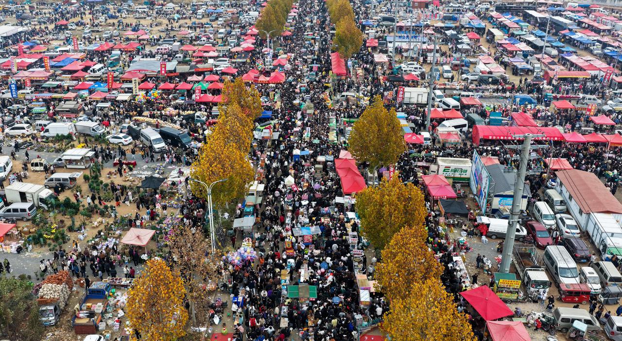 果然,九点刚过,车流开始涌入集市。十点不到,两公里长的街市已是摩肩接踵。江苏牌照的轿车、安徽的旅游大巴、河南的骑行小队……人们拎着空包而来,带着鼓鼓囊囊的购物袋离开。单日超十万人次的客流,并非一早爆发,而是在烟火气的召唤下,从四面八方慢慢聚拢,最终汇成一场温暖的市井潮汐。