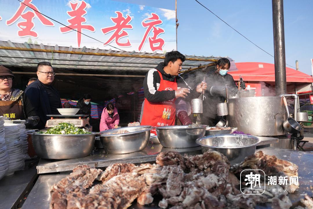 曹洼大集最火的摊位之一,是那家挂“张贺羊肉汤”招牌的老店。老板凌晨一点多起床,和妻子一起和面、调馅、熬汤。“我们家在这儿做了十几年,是曹洼最早做羊肉汤的。”他说。