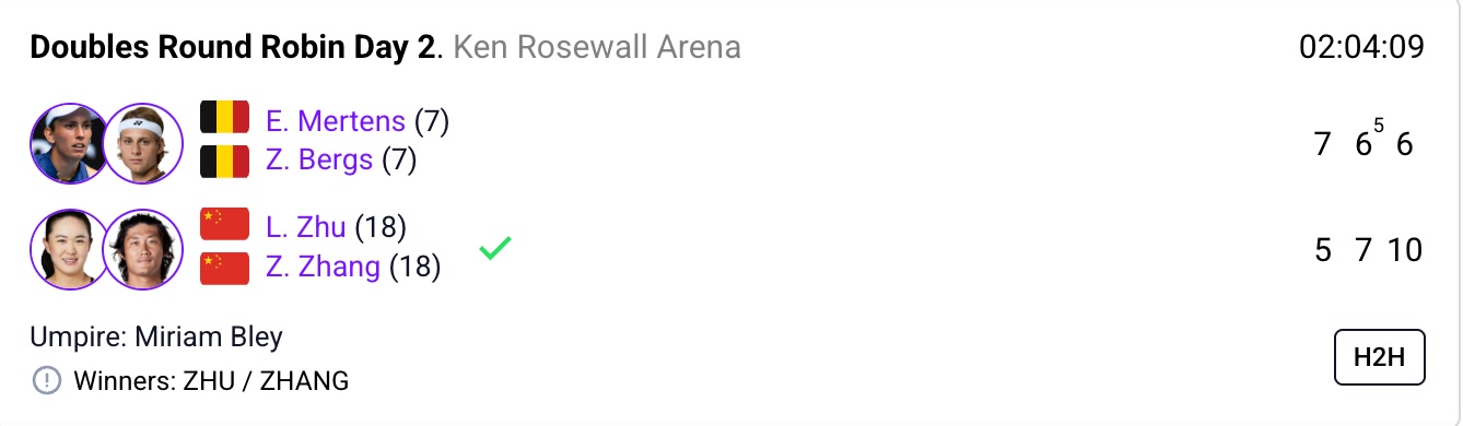 第三场混双较量,双方都派出最强球员,张之臻搭档朱琳对阵贝尔赫斯/梅尔滕斯组合。首盘,中国组合没有找到感觉,经过迅速调整后,将比分从0比5落后,扳平至5比5,只可惜被比利时组合7比5拿下。第二盘,朱琳/张之臻虽然一度浪费5比1领先,但还是以7比6(5)扳回一城,比赛进入“抢十”决胜。中国组合一路领先,最终以10比6获胜。中国队也拿下本次比赛的“开门红”。