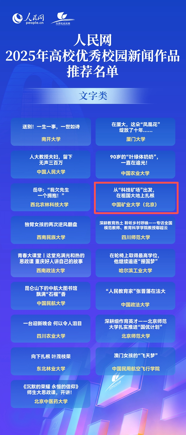 中国矿业大学(北京)力学与土木工程学院2022级力学专业博士生张鸣原撰写的通讯《从“科技矿场”出发,在祖国大地上扎根》,入选人民网2025高校优秀校园新闻作品——文字类,全国共有17篇高校文字类作品入选。