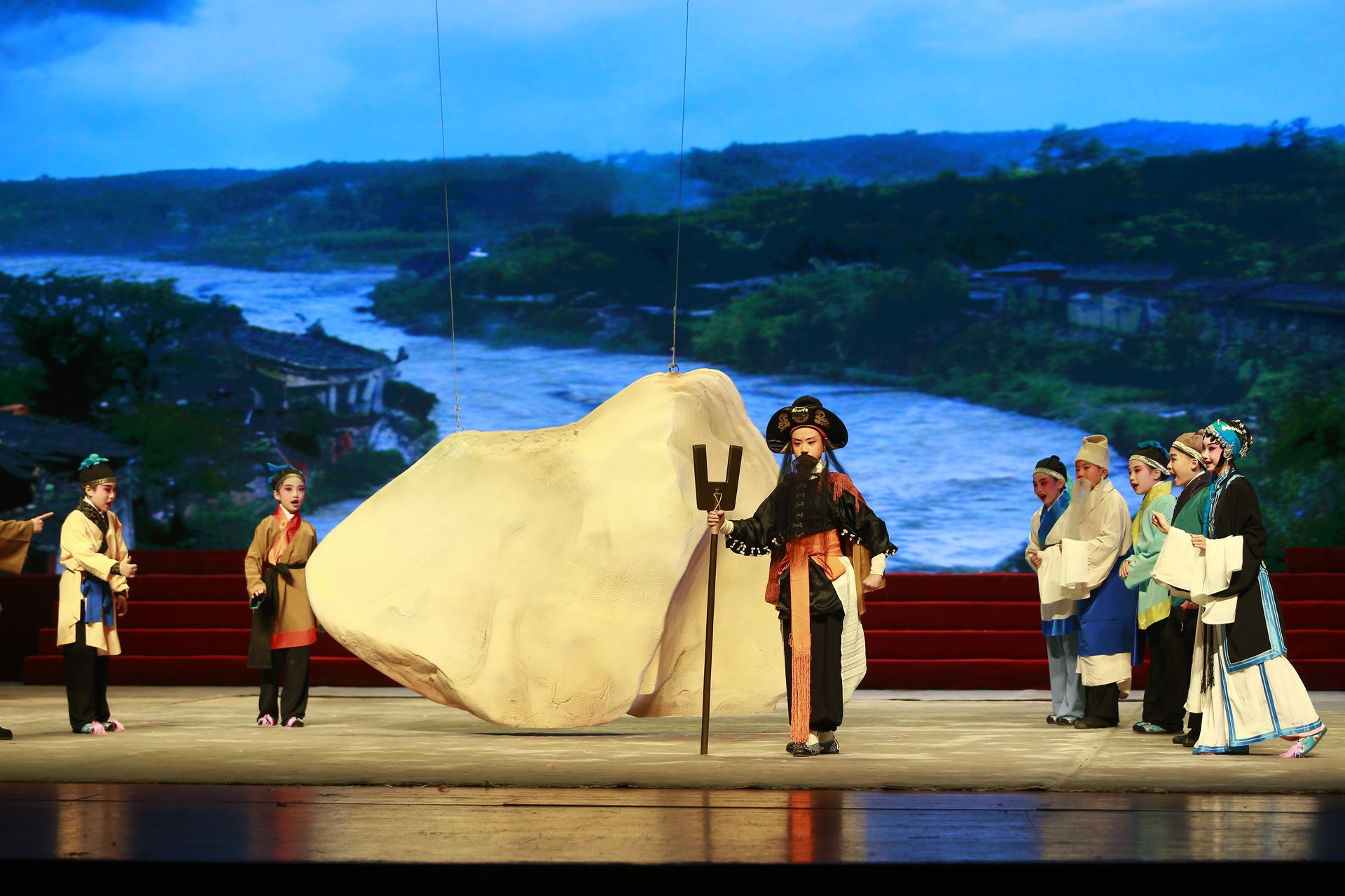 《京源传说》由54名学校金帆骨干团员参演,阵容强大、行当齐全,唱念做打舞精彩纷呈。演出以校园内一块刻有“源”字的奇石为线索,串联起校史馆招聘小讲解员的现代场景与大禹治水、天女赐福的神话篇章,巧妙融合校史、永定河地域传说与学校“求真尚美,明德至善”的校训精神。