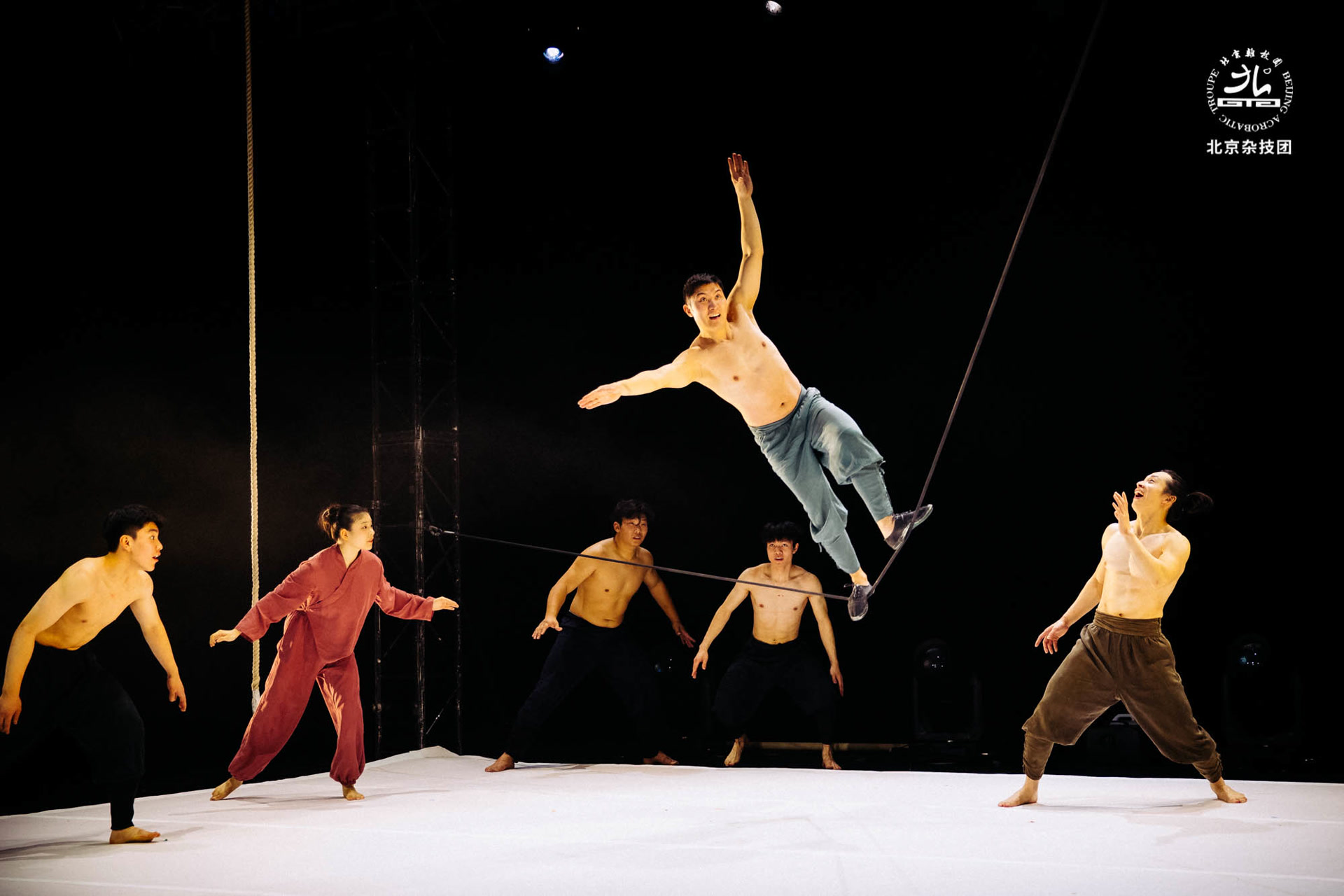 杂技剧成功的关键,在于“技”与“剧”实现有机的、高水平的融合,让技艺真正服务于深刻的故事与情感。在该剧中,“盗取神鸟蛋”“神鸟复仇”等情节,为绸吊、钻圈、柔术、滚环等各类杂技技巧提供了绝佳的、符合逻辑的展示场景。为了拿到挂在高空的蛋,五色和她的伙伴们时而叠罗汉,时而荡起绳索,时而在空中自如行走,这些高难度的技巧表演不仅诙谐有趣,而且展示了杂技的力量与技巧,自然地推动了剧情发展。