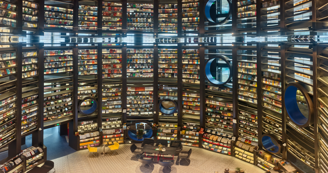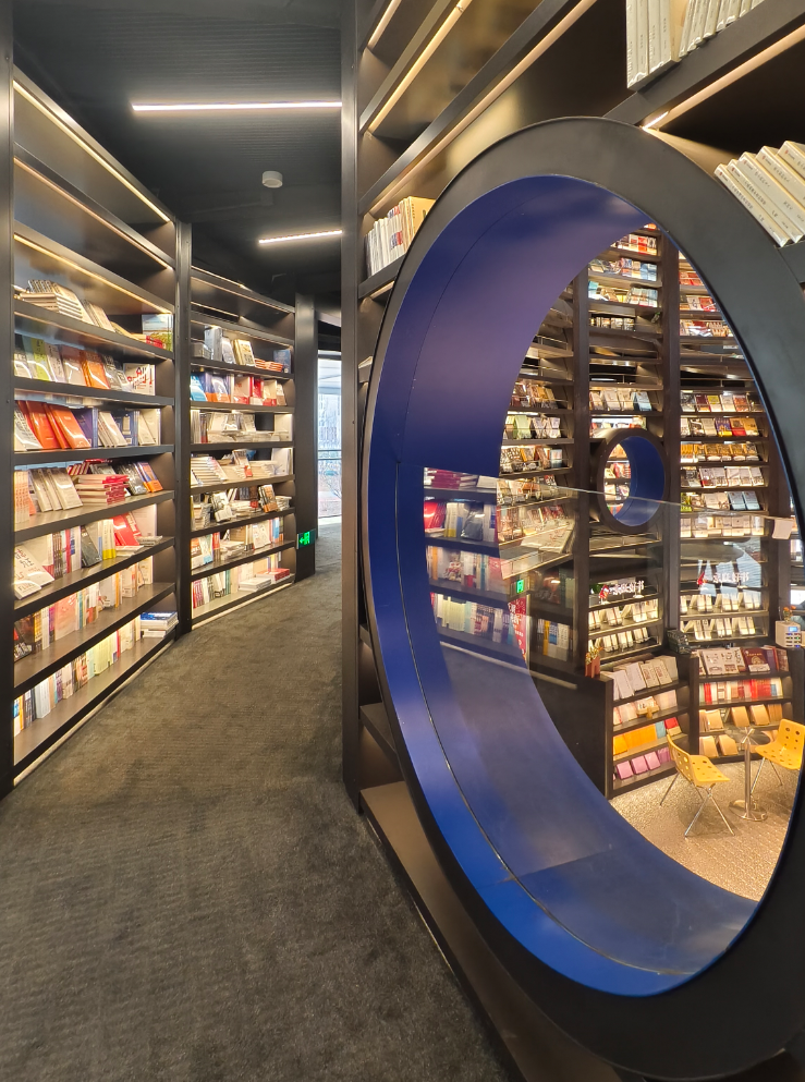 好的空间设计,能让人感受到时空的张力。无界书房把时空哲思和虫洞意象变成了能摸得着、感受得到的阅读氛围。在这里,科学的严谨和文学的浪漫撞个满怀。“设计灵感源自《星际穿越》中对时空与探索的诠释。”无界书房设计师米俊仁说,“我不想把书店做成千篇一律的样子,更想借着灵感造个穿越小天地,让大家在书香里偷得片刻自在,这既贴合怀柔科学城勇于探索创新的闯劲儿,也让书房多份打动人心的温度。”