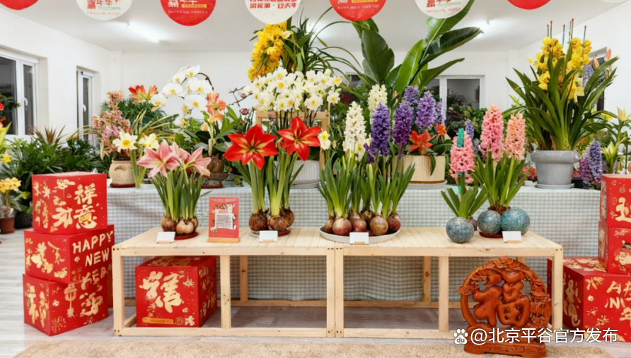 场景以朱顶红、水仙、百合、风信子等室内景观花卉组合而成,以多样的造型和丰富色彩为新春增添一份暖意,搭配平谷特色桃木装饰,营造“阖家团圆赏年花”的温馨氛围。