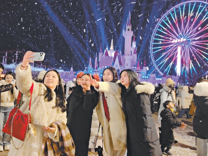 游客在石景山游乐园冰雪音乐新年季跨年活动上合影留念。本报记者 吴镝摄