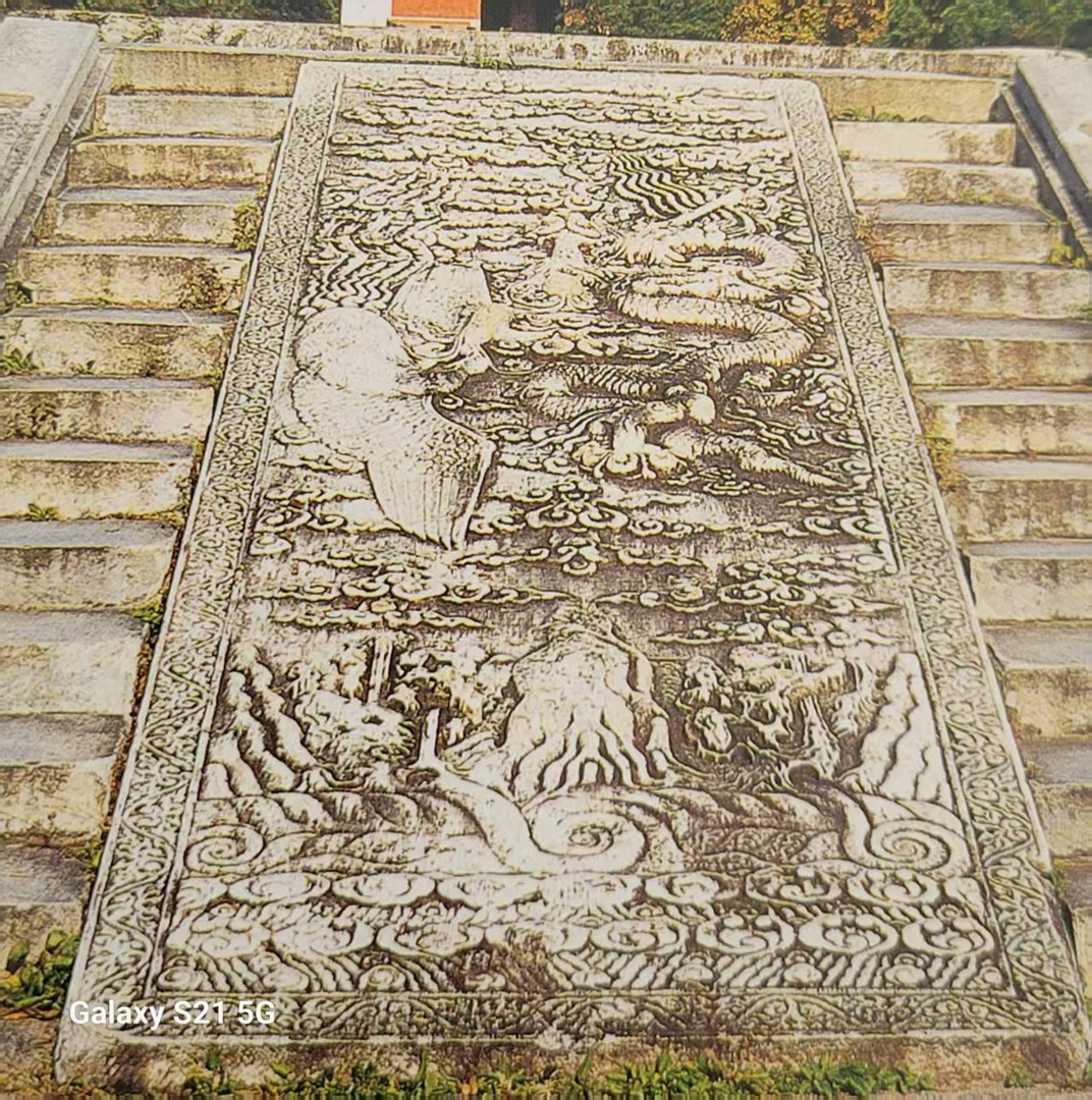 永陵的建筑还是值得一看的。祾恩门的巨大台基,规模超越了前代几座陵寝祾恩殿台基的高度,中央御路的石雕采用龙凤戏珠图案(见下图)。永陵宝城的明楼,从头至脚,包括斗拱结构全部用石料雕琢而成,“壮丽精致,孝、长二陵不及也”(顾炎武《昌平山水记》中语)。