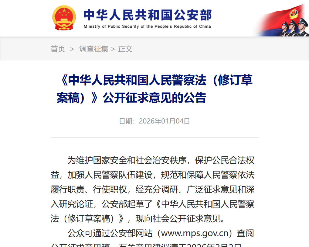 公众可通过公安部网站(www.mps.gov.cn)查阅公开征求意见稿,有关意见建议请于2026年2月2日前,通过公安部网站在线提出或者通过电子邮件方式发送至rmjcfxd@163.com。