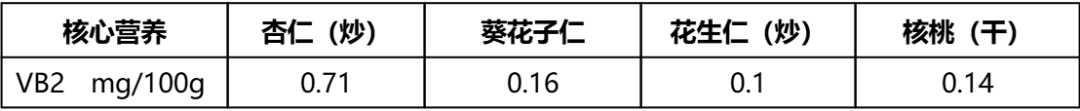 杏仁在维生素 B2 含量上优势极为明显,高达0.71毫克/100 克,是花生 7 倍、葵花籽和核桃的 5 倍,远超其他几种坚果。