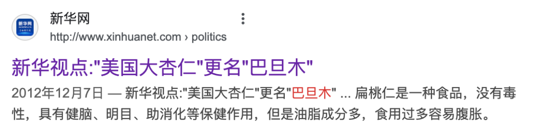 [2]新华网.新华视点:"美国大杏仁"更名"巴旦木".https://www.xinhuanet.com/politics/2012-12/07/c_113950920.htm
