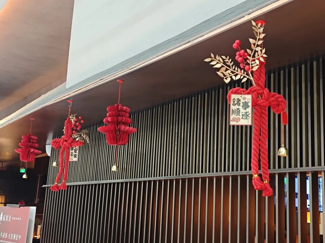 餐厅吊顶的红绳挂饰缀着