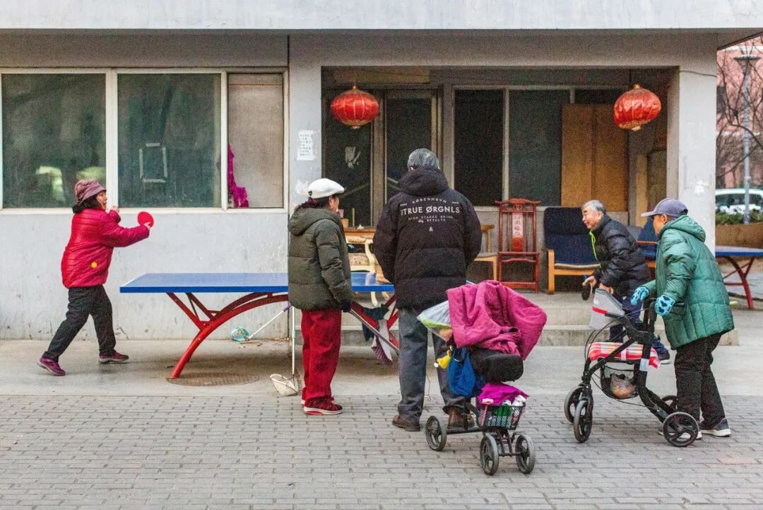 居民们围着乒乓球桌挥拍