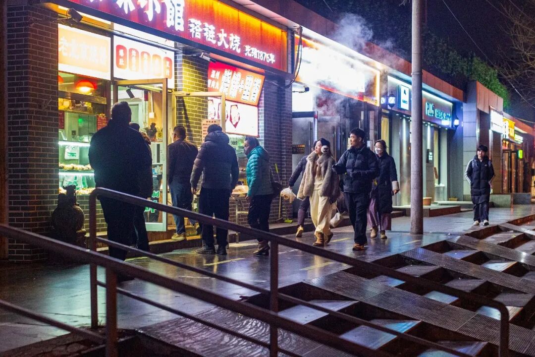 排队买小吃的居民浸在暖黄灯光里