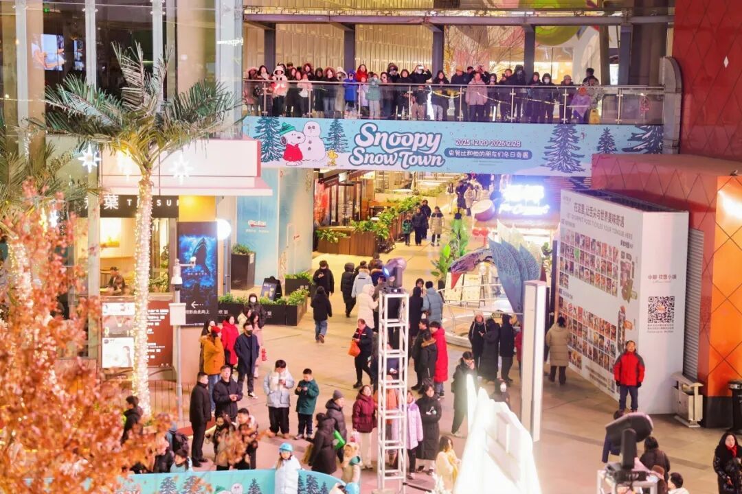 中粮·祥云小镇打造沉浸式童话雪景与互动体验。经典IP史努比惊喜现身,主题装置与创意美陈点亮街区,多个打卡点位串联成线,吸引市民拍照留念,节日氛围从入口一路延伸到街巷深处。