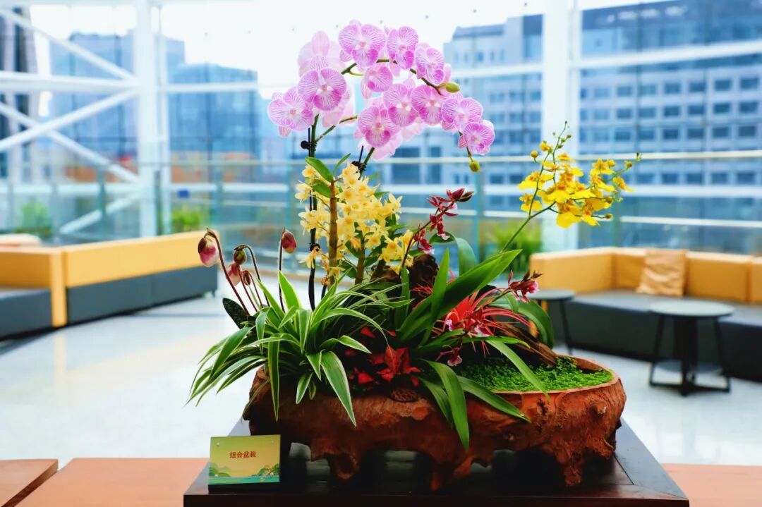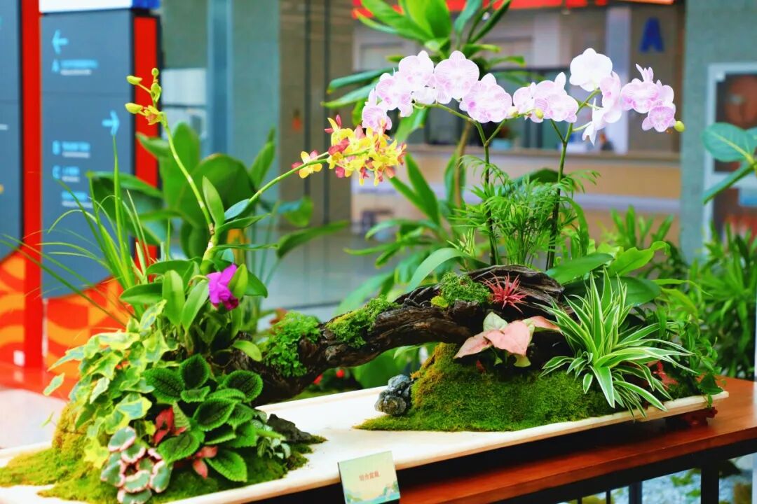 组合植物造型借鉴山水盆景手法还原植物的原生环境。以沉木为骨架,体现了兰科植物附生的原生习性,周围苔藓、皱叶冷水花、菖蒲等绿植配植,复刻出林下物种共生的微景观。
