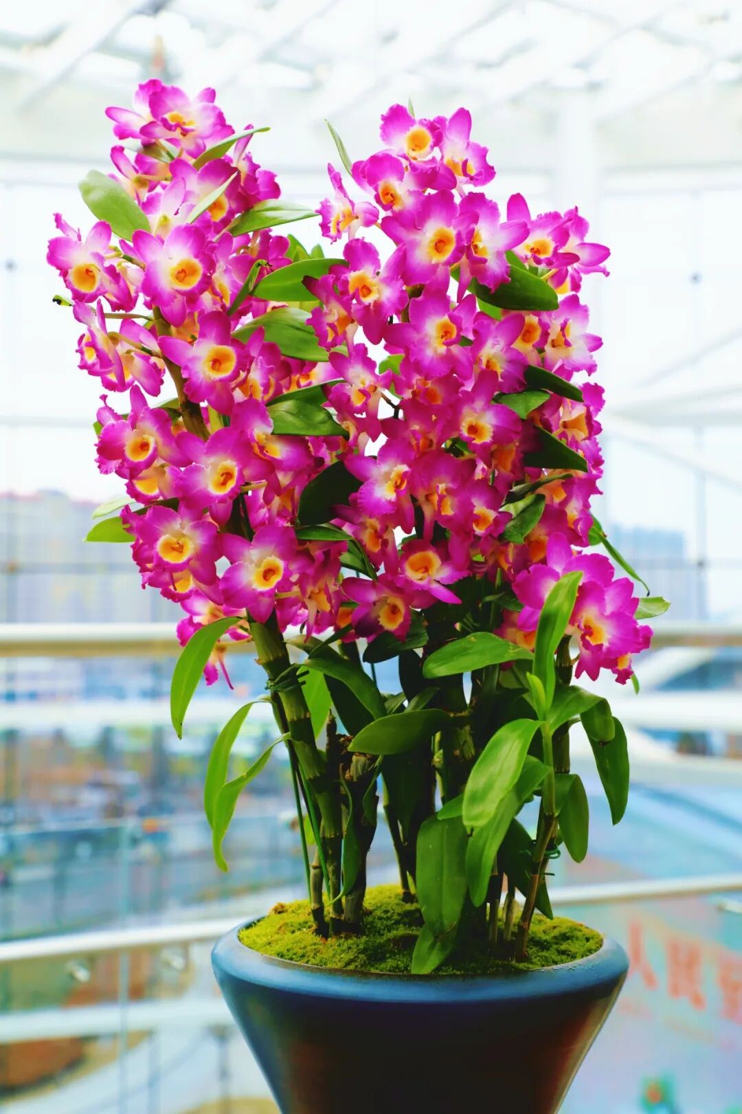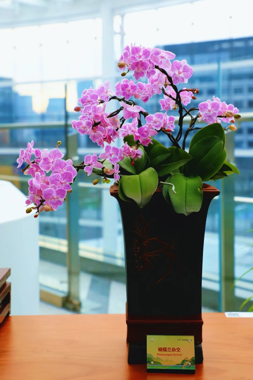 蝴蝶兰盆栽,采用了盆景蟠扎技法,顺花茎生长势,以金属丝重塑枝条弧度,对兰花形态进行艺术重塑。